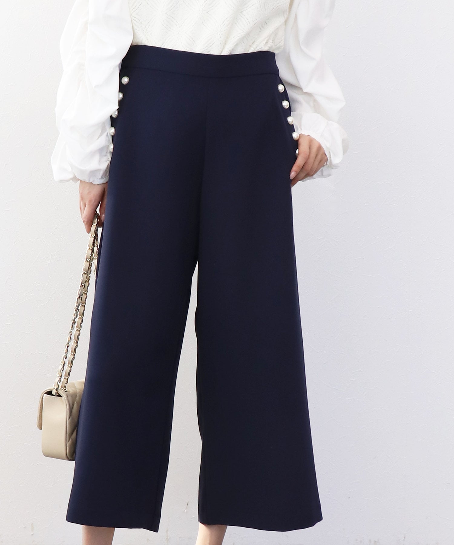 パールデザインがポイントのワイドパンツは縦ラインを強調し、コートのボリュームを受け止めながらスタイルアップを叶えてくれます♡