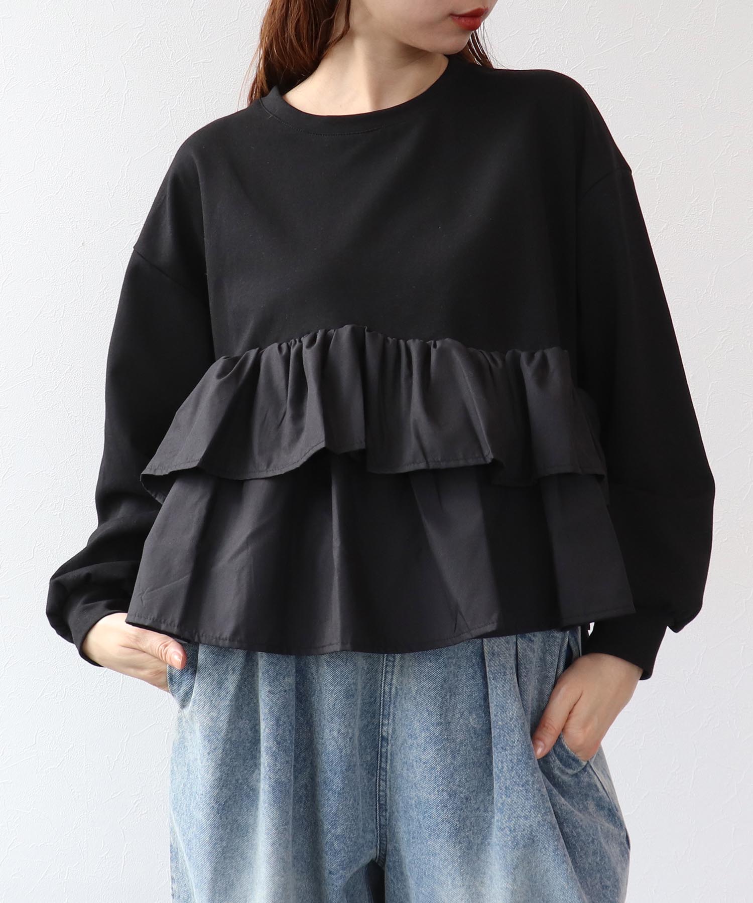 プチプラで叶う甘めフェミニントップス。お腹周りをさりげなくカバーしてくれます。