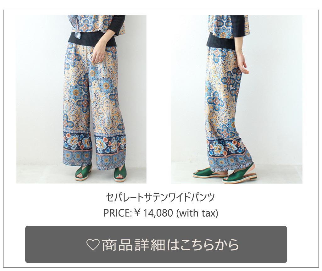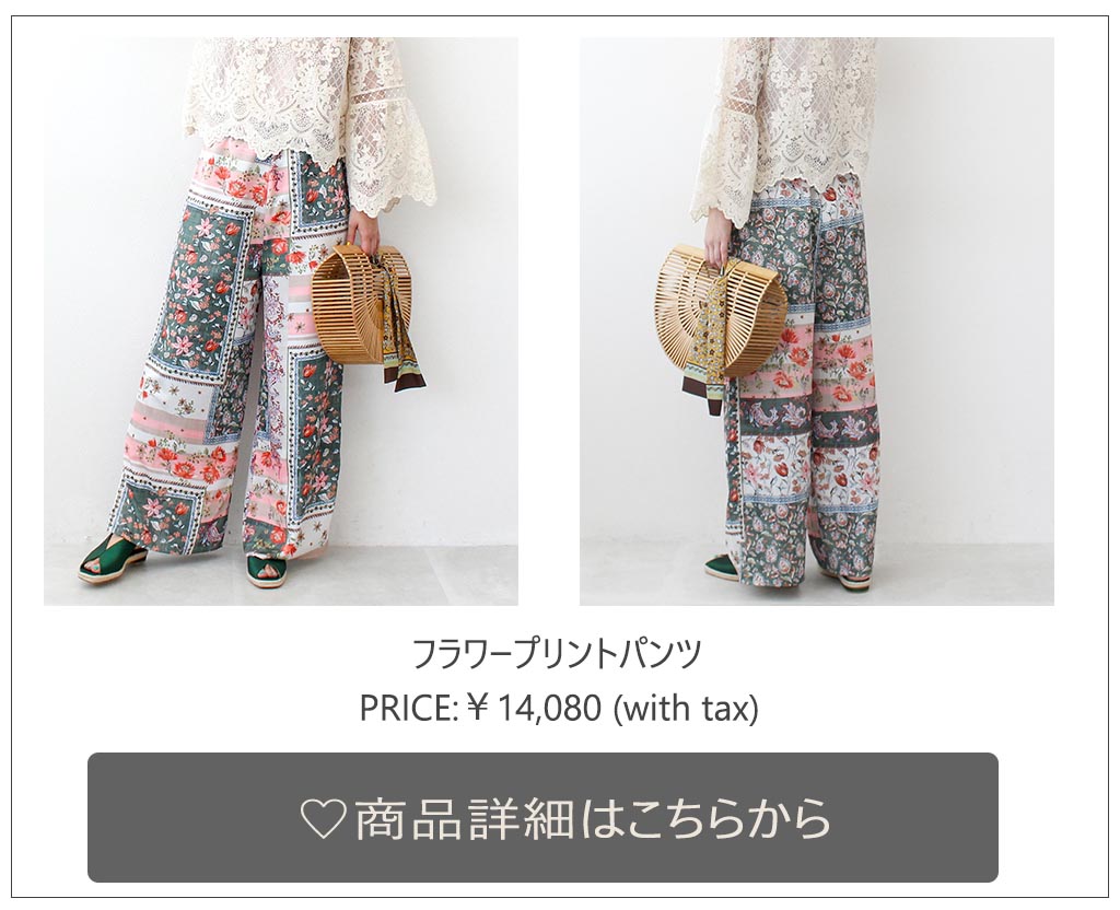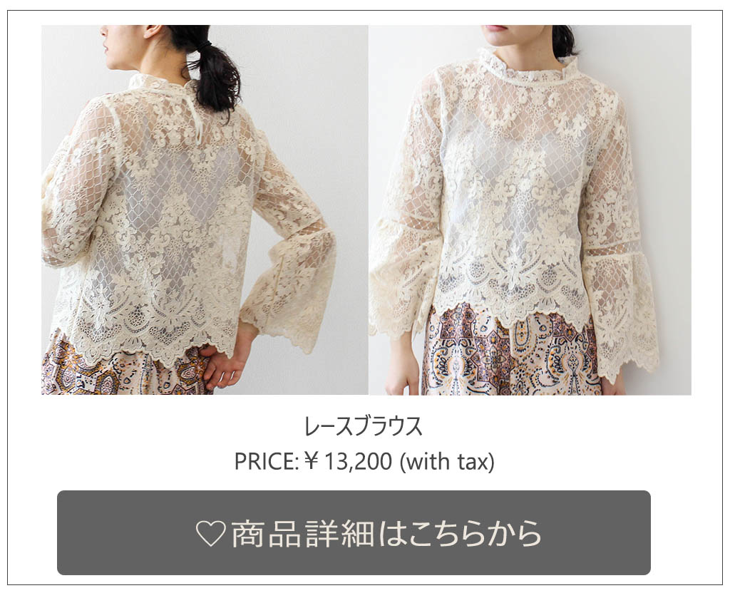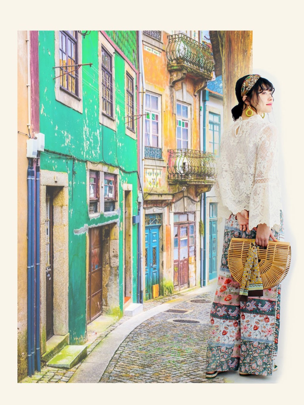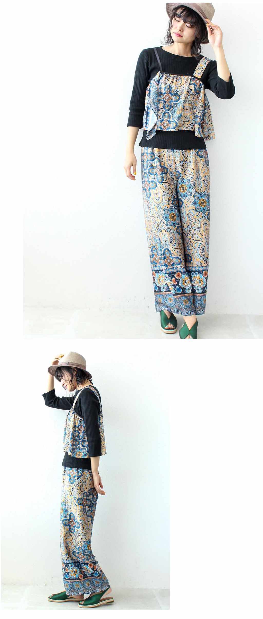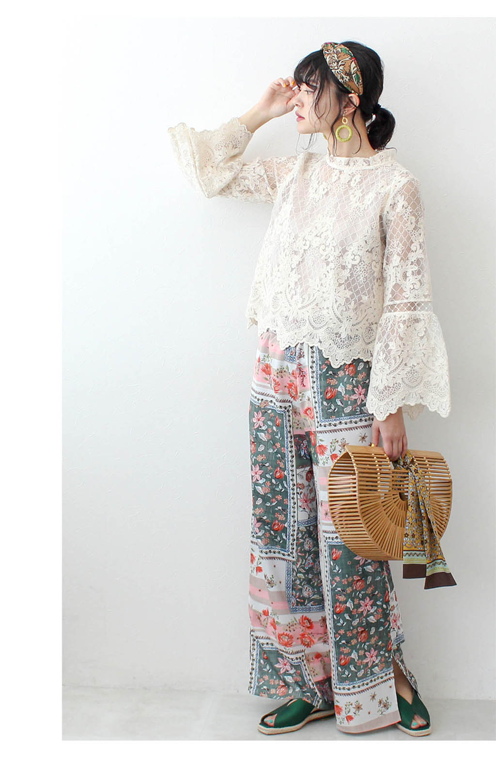 レースを贅沢に使ったTOPSとパッチワークのような街並みをイメージしたエキゾチックなMIX柄パンツで、レトロなボヘミアンスタイルの完成!