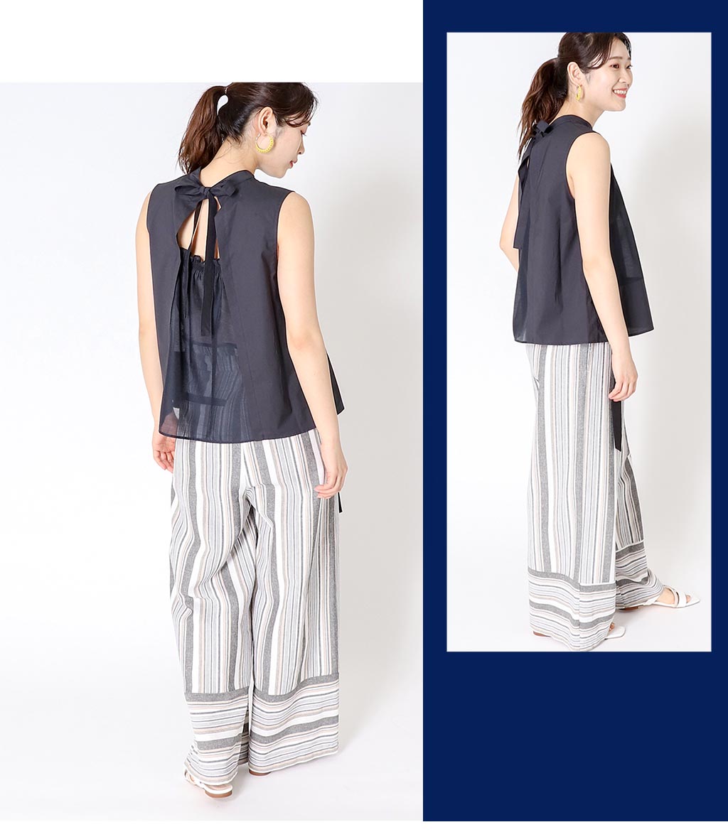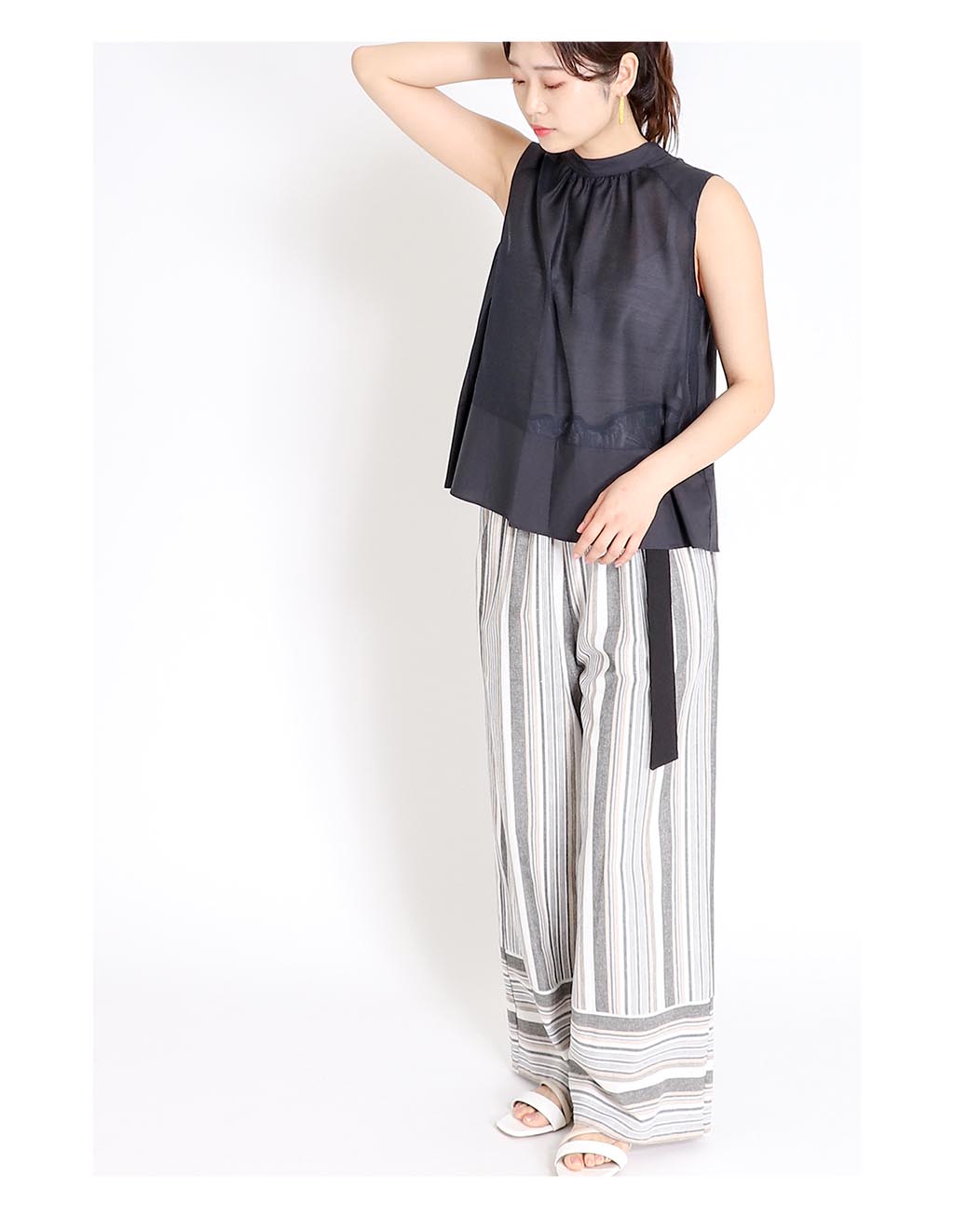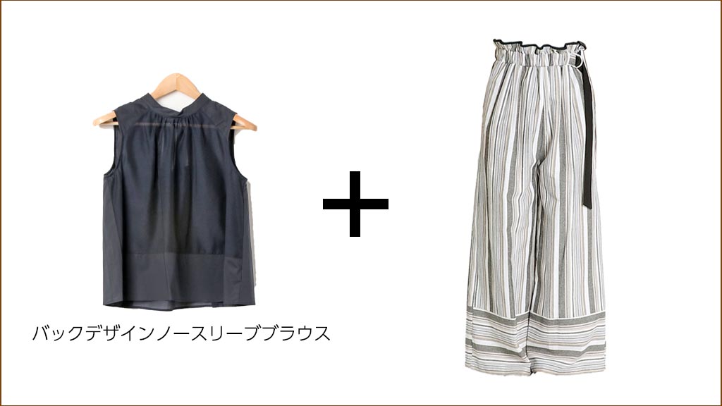 ■トレンドのシアー素材TOPS+ストライプパンツですっきり見せ