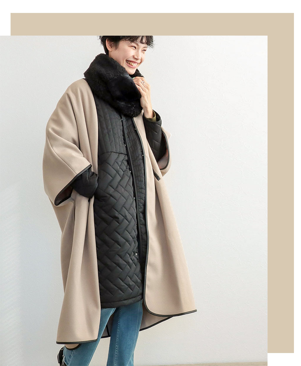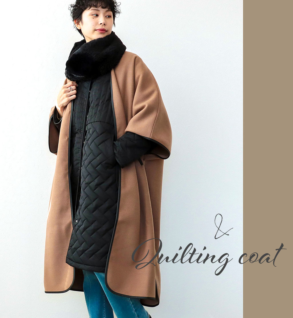 シンプルなキルティングコートはインナーにしても◎ドルマンスリーブだからできる技です!