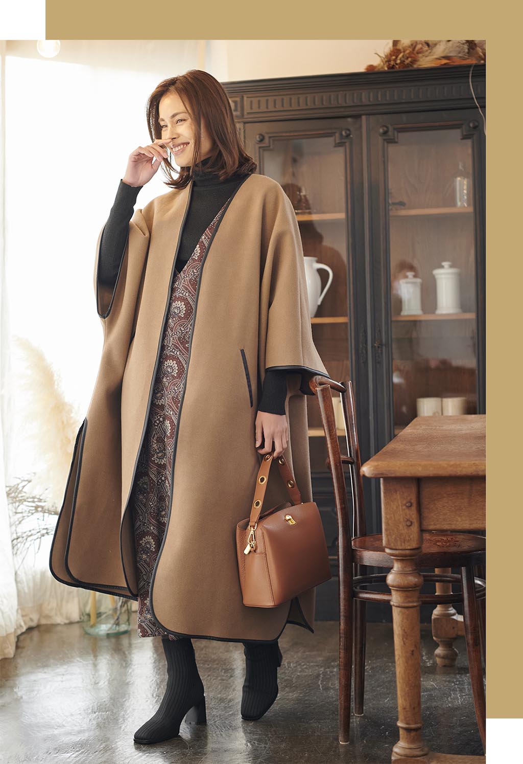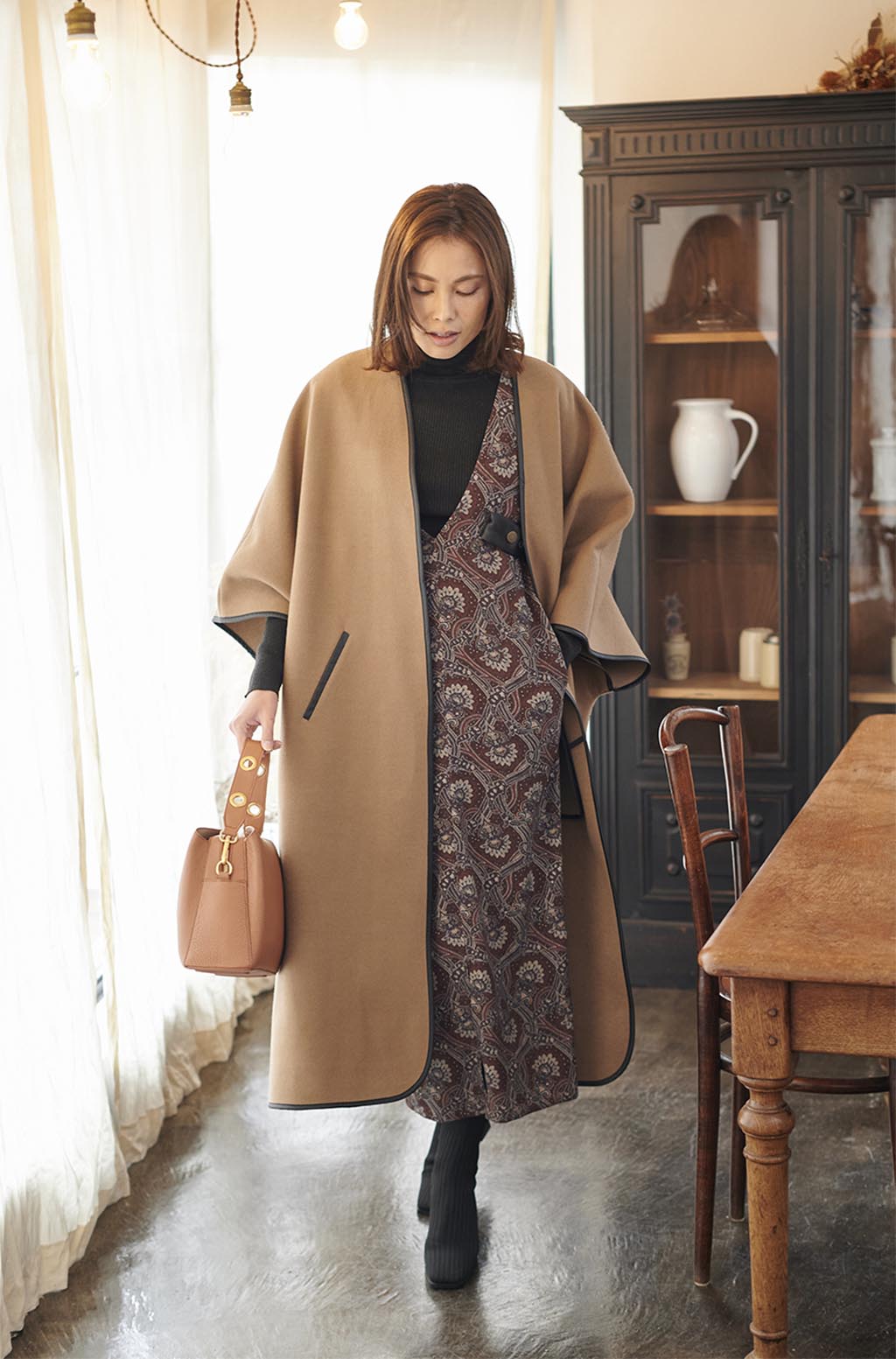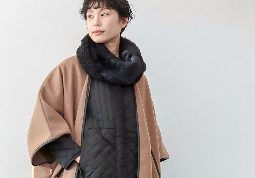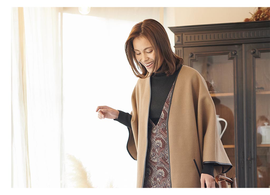 身頃から続いたドルマンスリーブタイプのコートには、タイトですっきり見えるワンピースを合わせると大人な着こなしに。