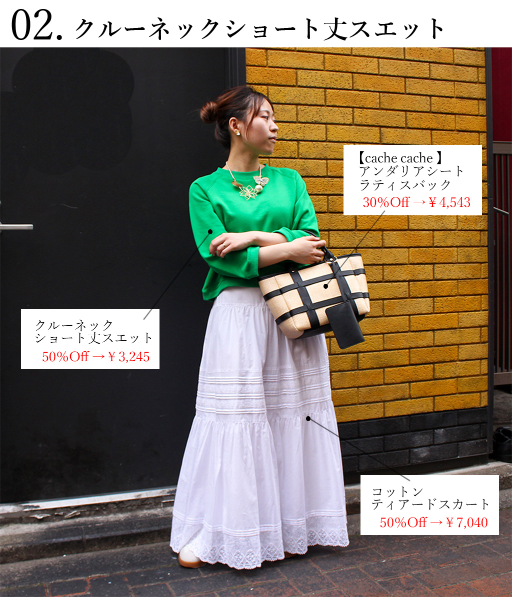 緑トップスに「白」を合わせれば、軽やかな雰囲気に仕上げることができます。