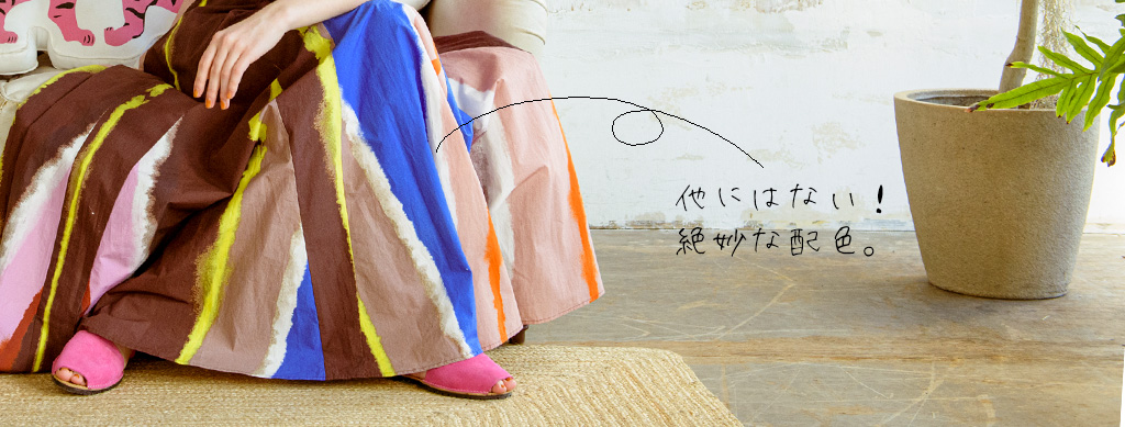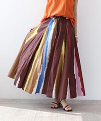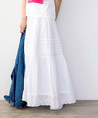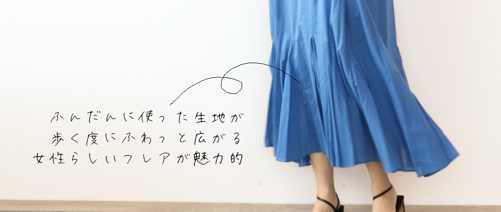 たっぷりの生地をつかったマキシスカートが主役のコーディネート。