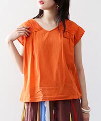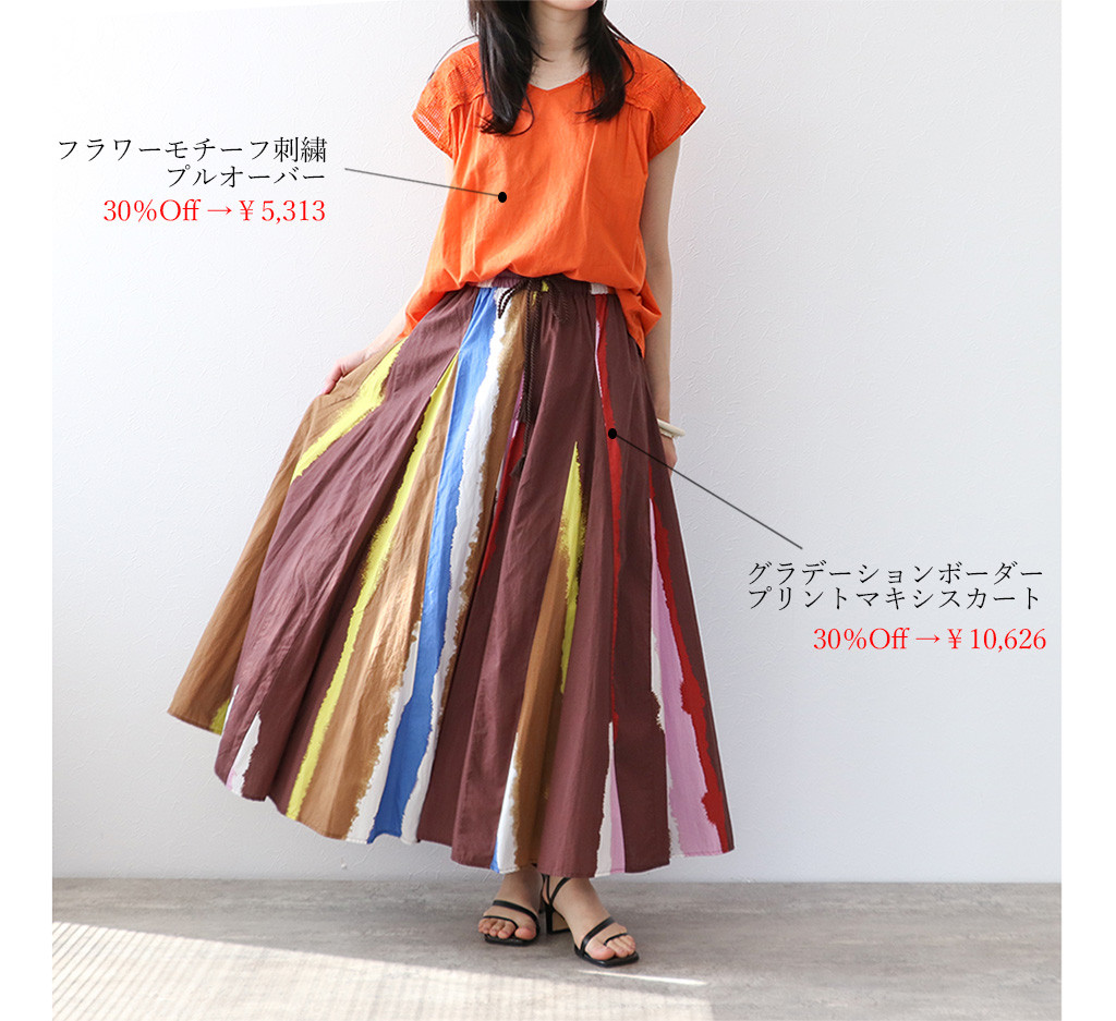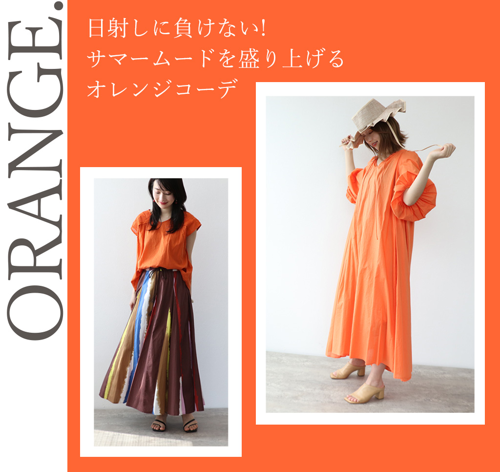 インパクトのあるスカートに負けないオレンジのTOPSを合わせるのがおすすめ。