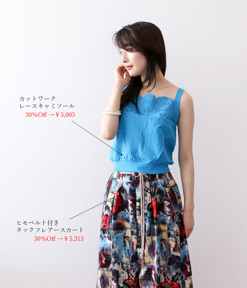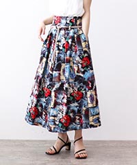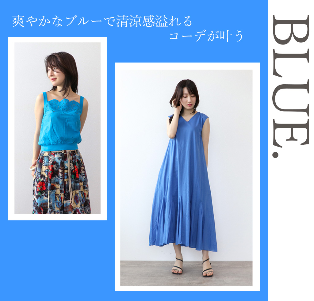 肌の色をきれいに見せてくれるブルーを、個性的な柄のスカートと合わせるのがおすすめ。