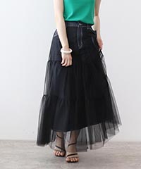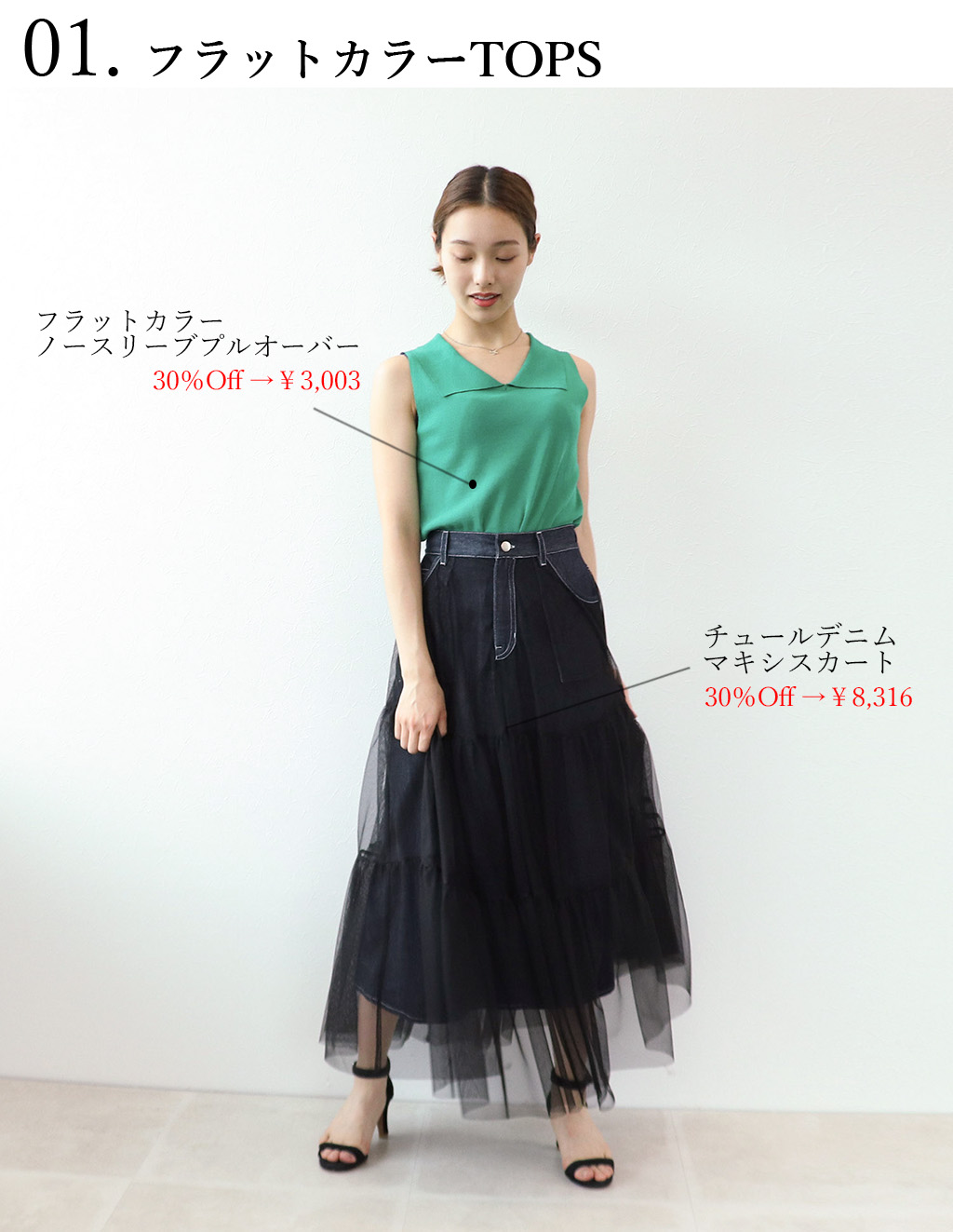 首回りがすっきり見えるフラットカラーでガーリーキチンと見えな印象になるトップス。上半身はコンパクトなので、ボトムスにはデニム×チュールのボリューミーな甘辛スカートを取り入れて、大人可愛いスタイルの完成!
