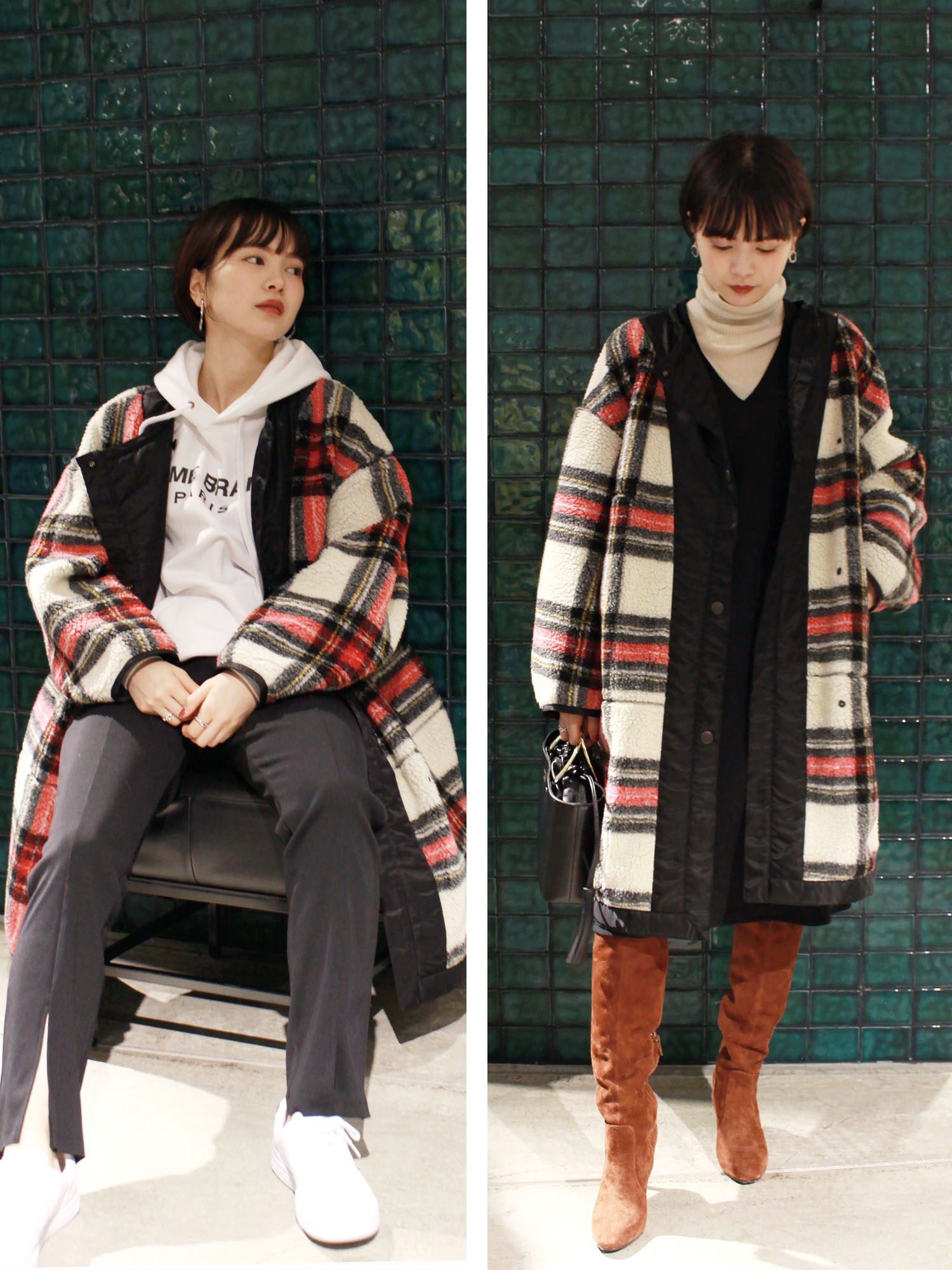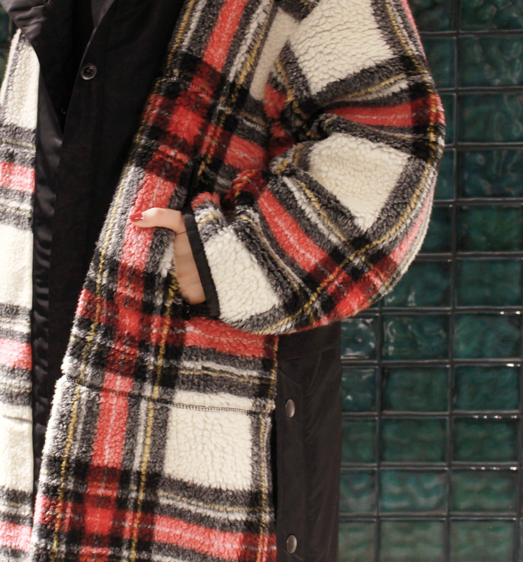 もこもこの素材感がキュートな伝統的なチェック柄のボアコート。