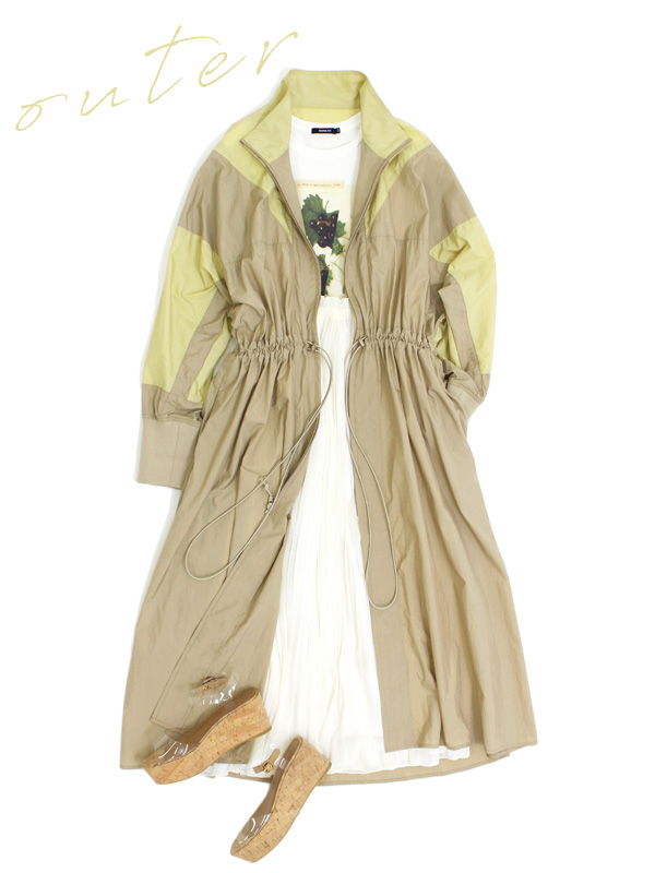 柔らかいベージュとのニュアンス配色にホワイトでメリハリを。