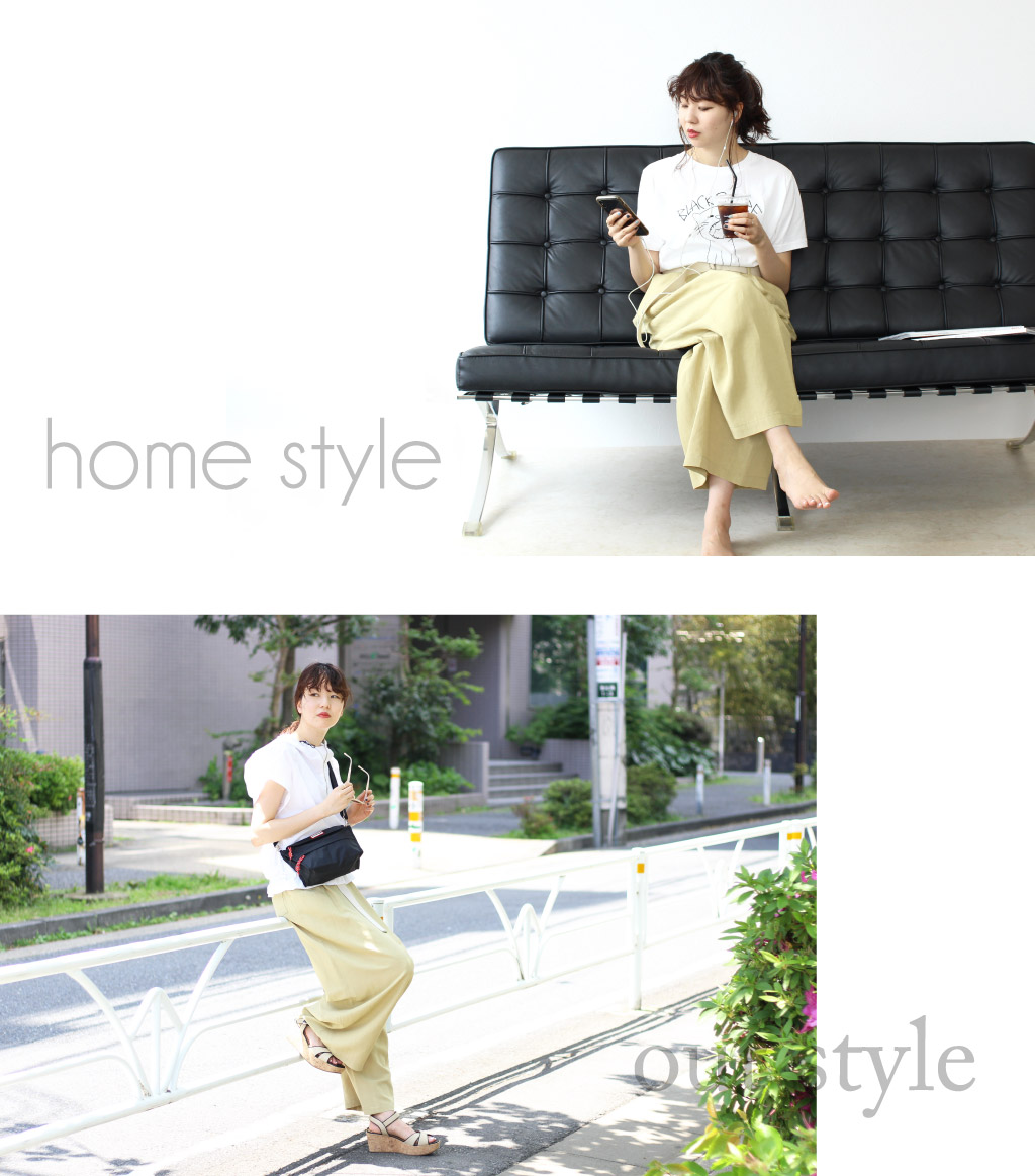 自宅ではプリントTで抜け感を、外出時はスポーティーにまとめて。