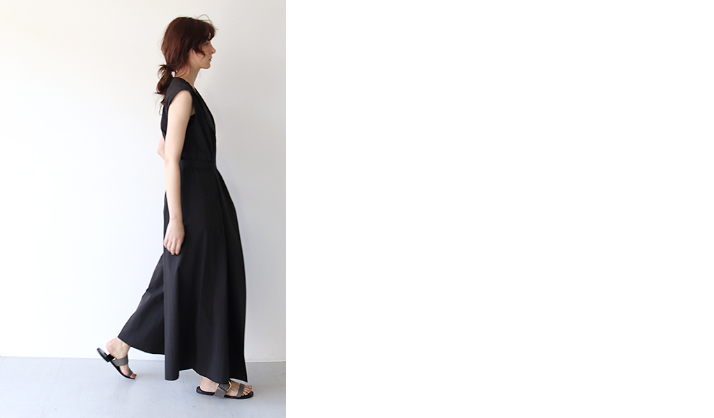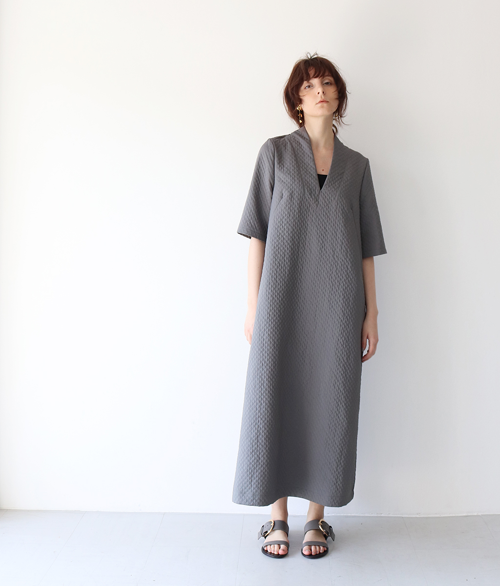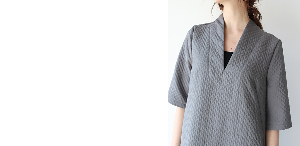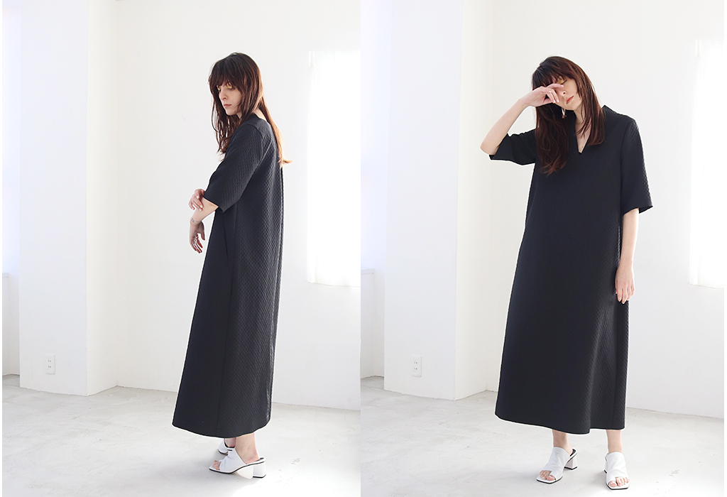 シャープなネックラインがすっきりとしたクリーンな印象。
