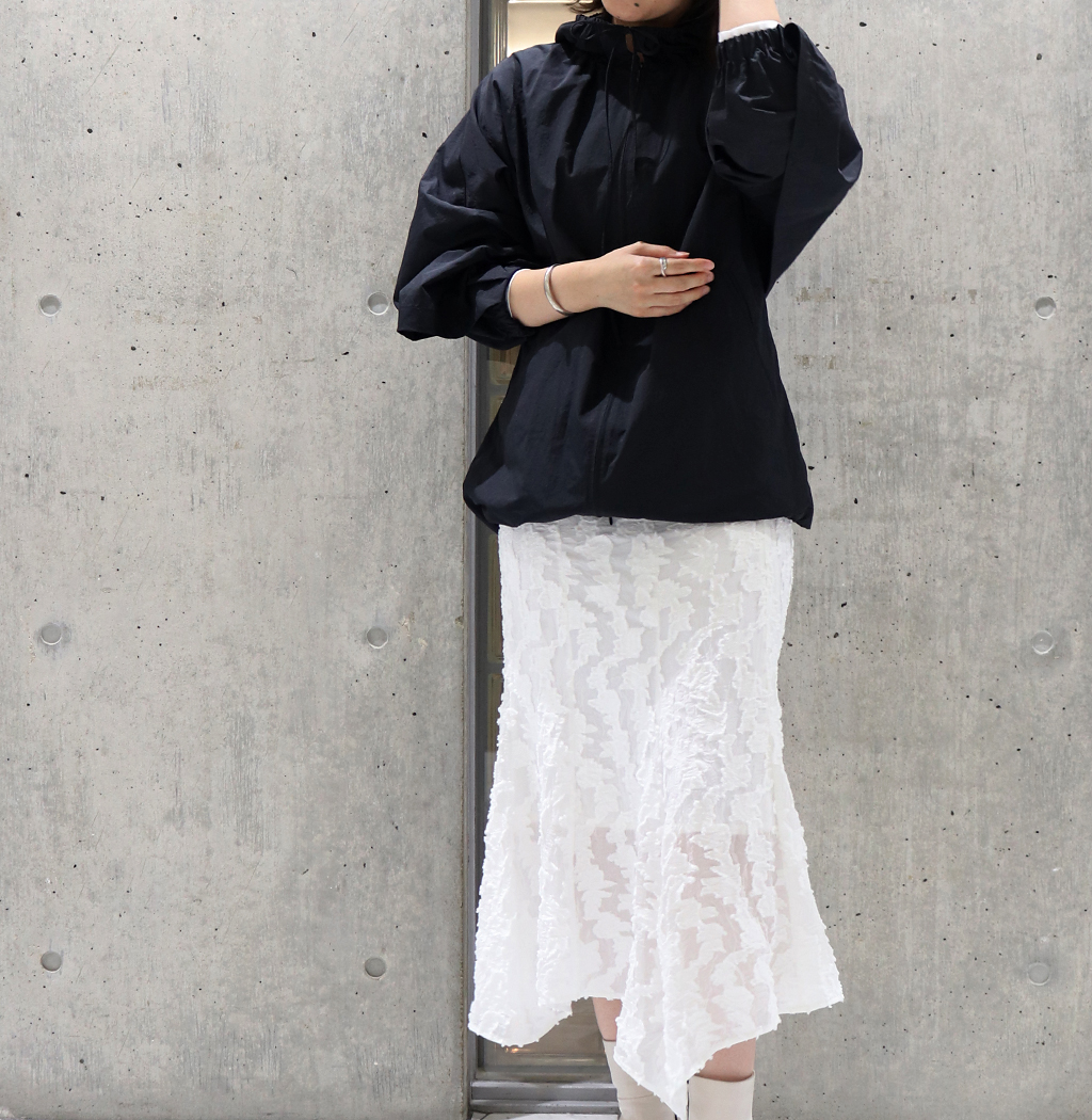 スポーティーな印象のブルゾンとカットジャガードのスカートを合わせた