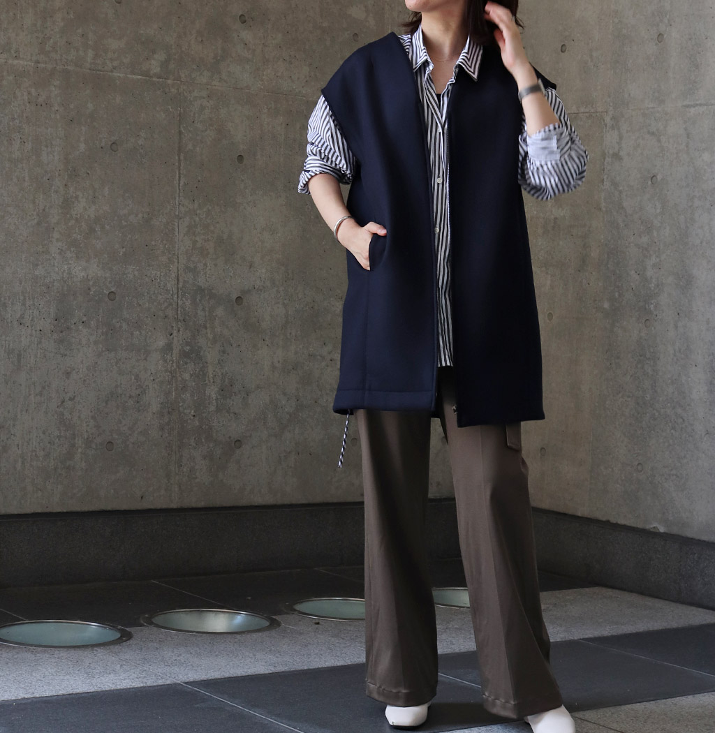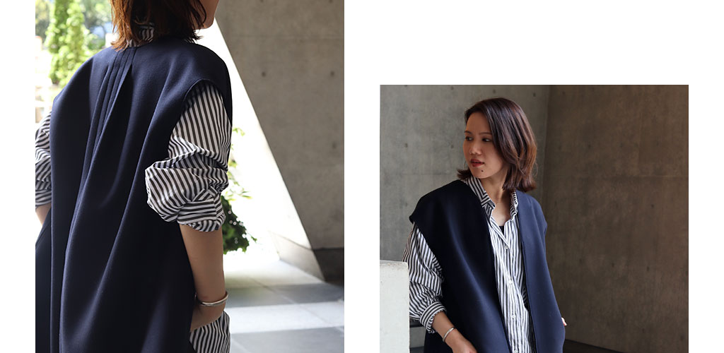 すっきりとしたネックラインのジレと