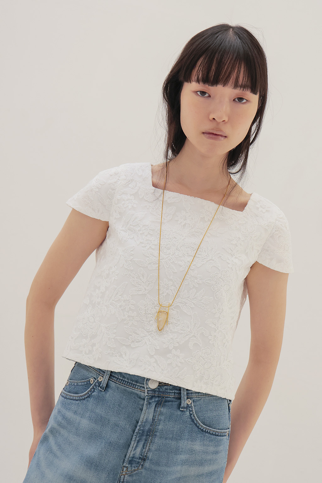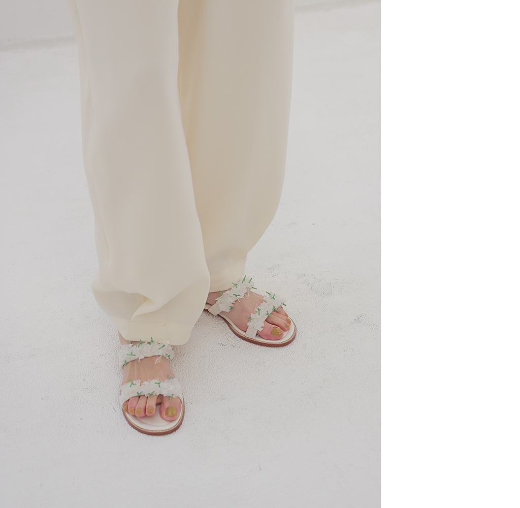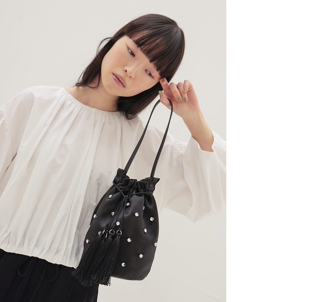 モードなスタイルに、静かなフェミニンエッセンスを。