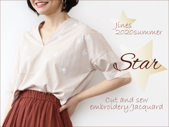 星の刺繍をフロント部分に散りばめた薄手なカットソー。 さりげない刺繍使いはカジュアルさと女性らしさを兼ね備えたデザイン。デコルテが綺麗に見えるVネックはジャケットのインナーとしても重宝します。