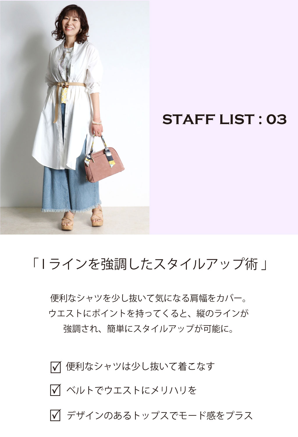 シャツワンピース(RACEA)¥15,400/ブラウス(Three Four Time)¥9,790/パンツ(CEPICA)¥17,300/バッグ(CEPICA)¥6,490/ベルト(TITE in the store)¥8,800/
