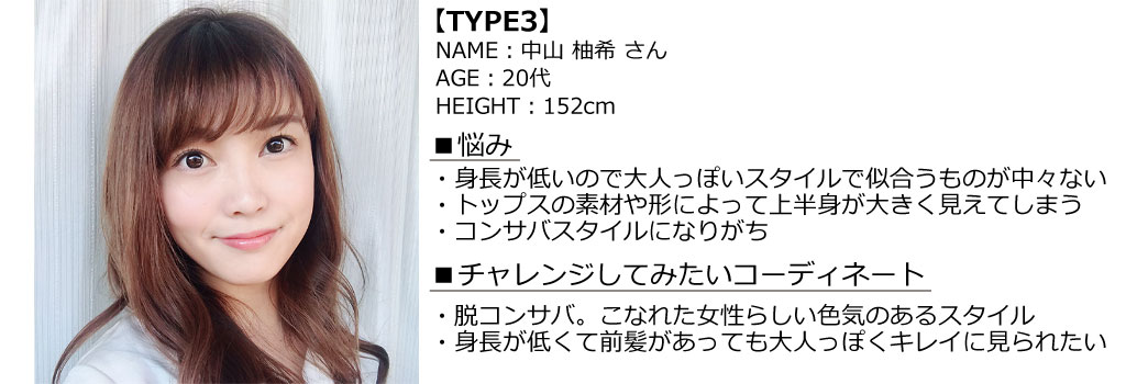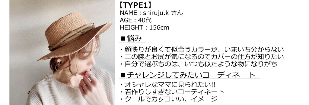 今回は、インスタグラムキャンペーンでご当選された3名様のお悩み別トータルコーディネートをご紹介致します。