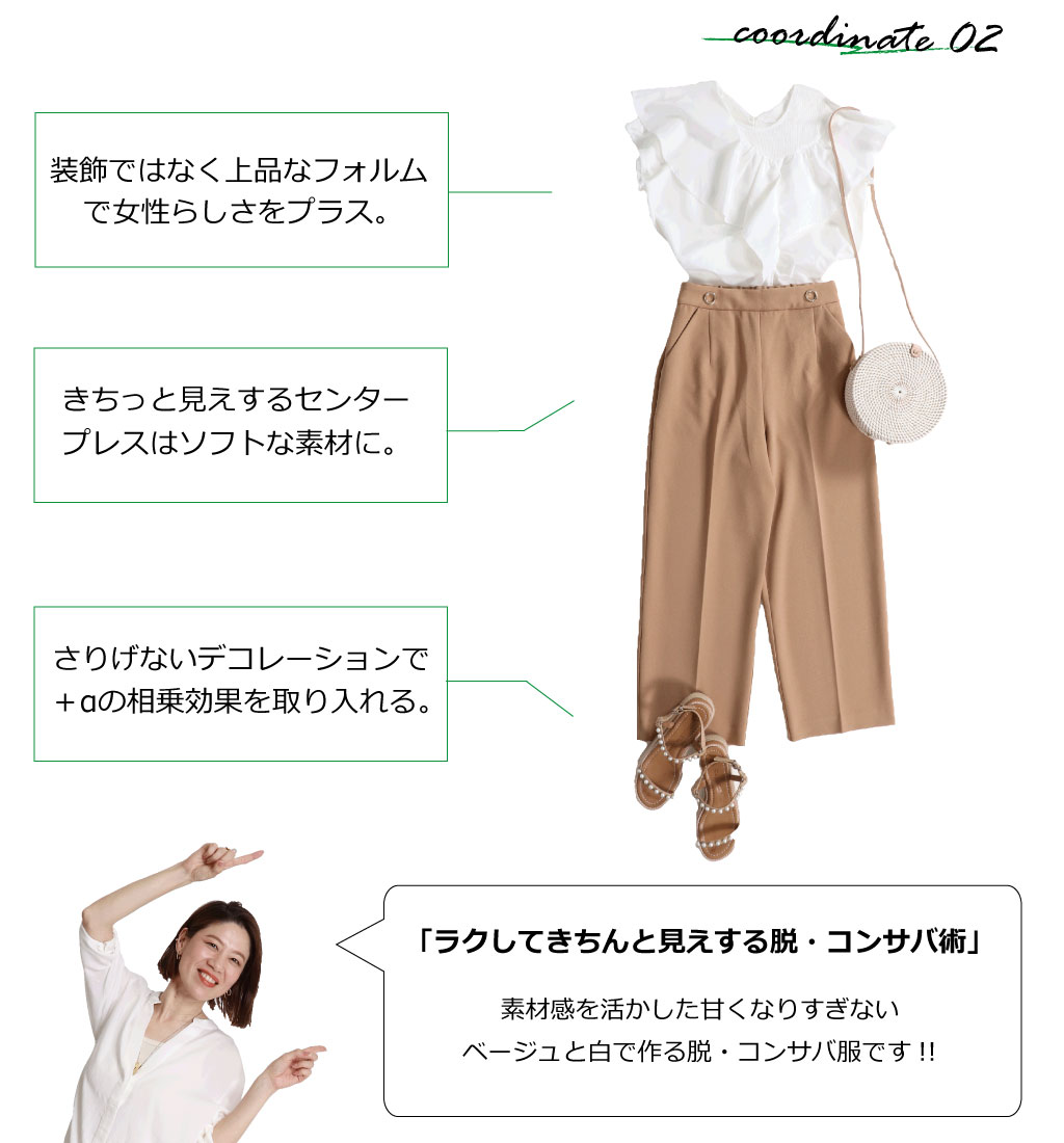 ブラウス(DRESSLAVE)¥17,600/パンツ(RACEA)¥13,200/バッグ(CEPICA)¥7,590/シューズ(DRESSLAVE)¥24,200