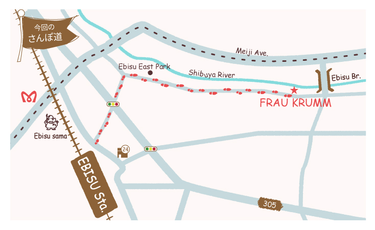 恵比寿駅東口から渋谷川沿いの小道を進みます。