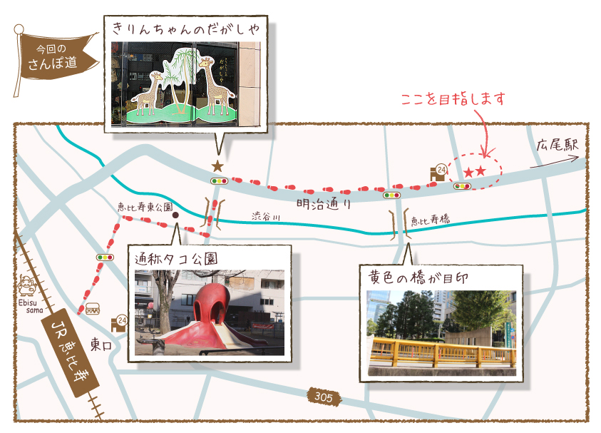 ちょうど恵比寿駅と広尾駅の間くらいに赤いテントが見えてきます。