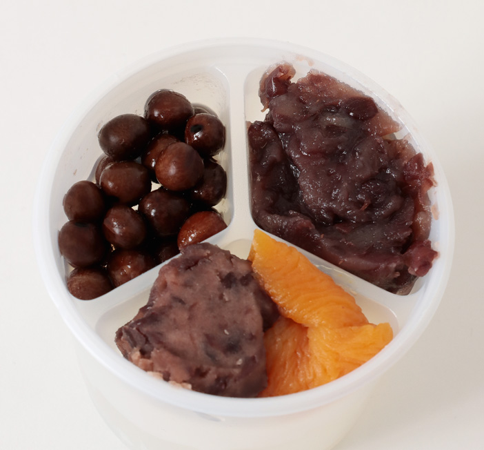 あんみつと言えばあんこに豆、求肥、フルーツなどが上段が3つに分かれたパッケージにそれぞれ具材が乗ってますが、こちらのあんみつは全体的に茶色です。