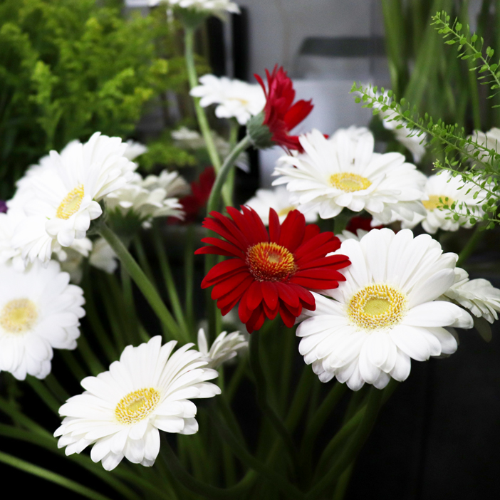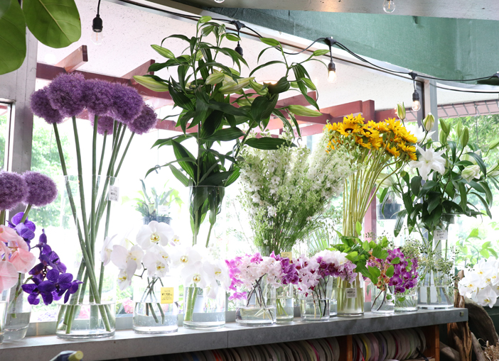 店内に入ると広い窓から差し込む光を浴びた色とりどりの生花が目に飛び込んできます。