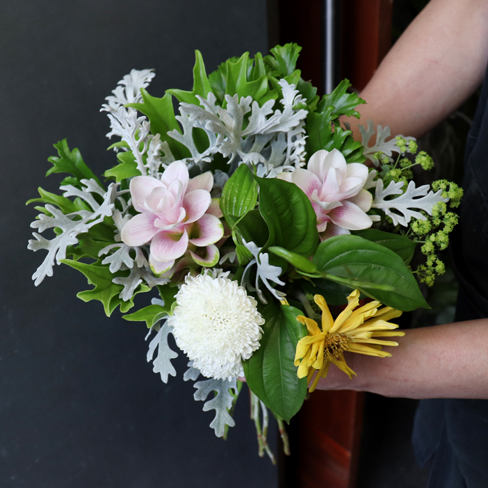 自宅に飾るなら野原で摘んできたような葉っぱ感のあるナチュラルさが好きなので、緑を多めの花束を作ってもらいました。