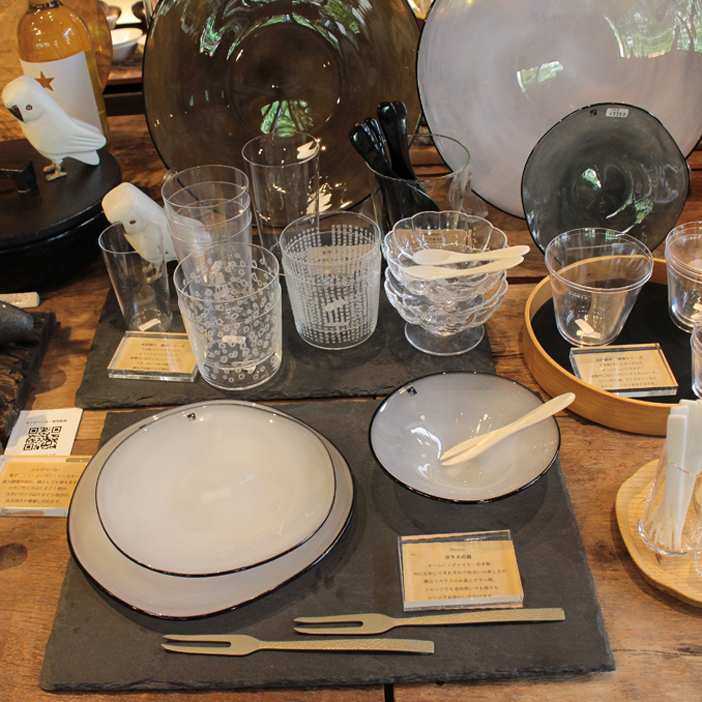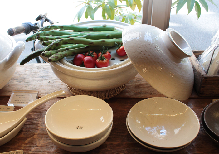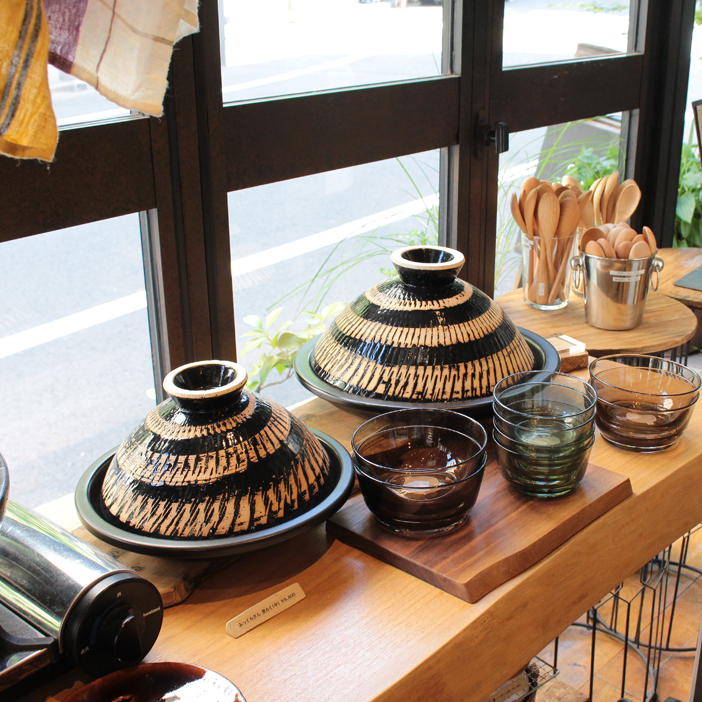 ガラス越しに日の光が差し込む店内にはセンスの良い食器やキッチン雑貨が並びます。
