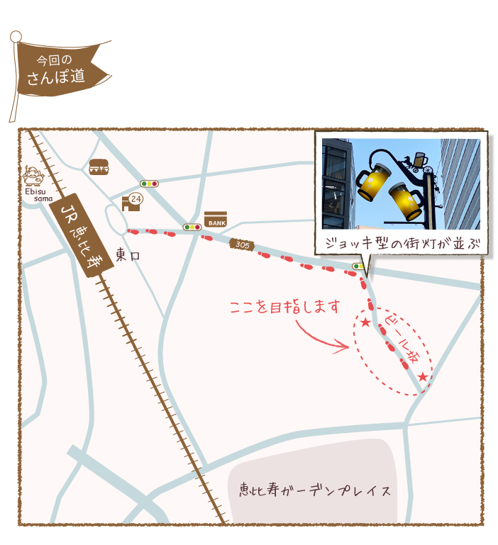 恵比寿駅東口からロータリー横の坂を下り、2つ目の信号を右に曲がりると「ビール坂」に入ります。