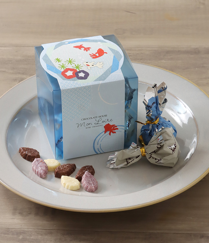 涼しげな「金魚」をモチーフにしたパッケージはブルーベリーやヨーグルトなど爽やかなフレーバーが入った夏限定。