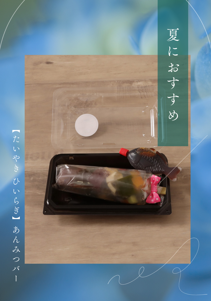 アイスキャンデーのような見た目と魚型の容器で、どこか懐かしさを感じる「あんみつバー」