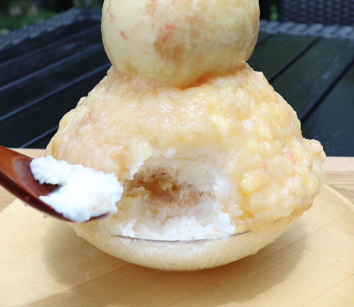 桃ヨーグルトと桃コンポート、てっぺんには丸ごとの桃が君臨した贅沢なかき氷。