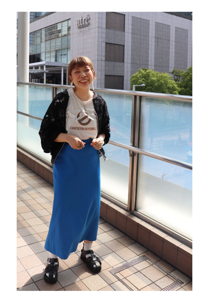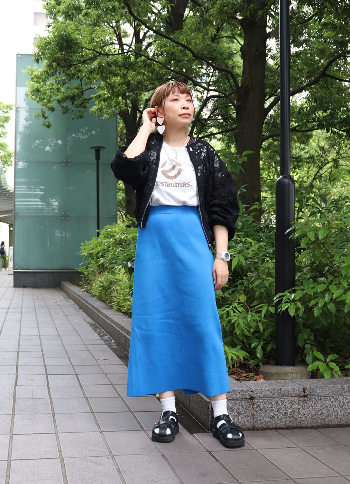 店舗でも大人気の透け感のあるレースのブルゾンを中心に、昨年CepicaでリアルバイしていたTシャツとお気に入りのブルーのスカートでコーディネートしました。