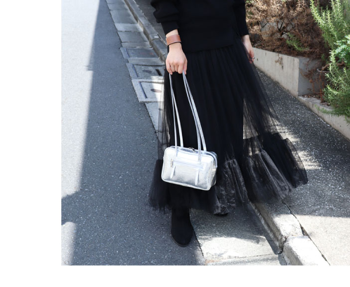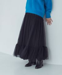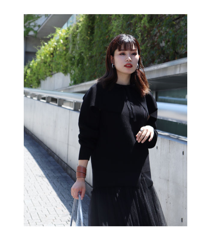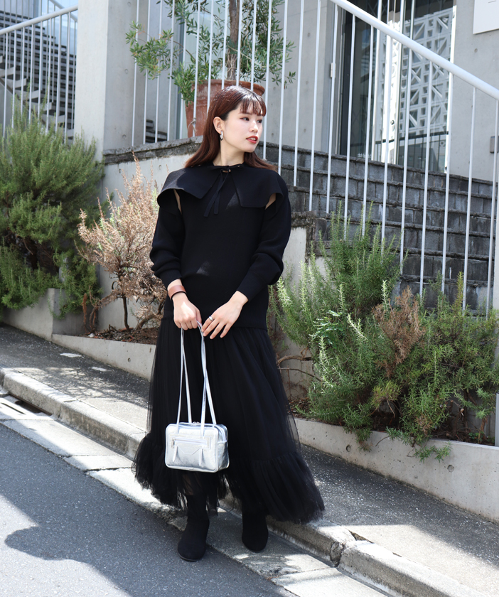 オールブラックですがチュールスカートの透け感で軽やかさを出しています。