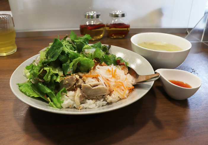たっぷり野菜(このリーフサラダが旨い!)の中に蒸し鶏がゴロゴロ入っていて、鶏の出汁が効いているのか全体的に旨味があります。