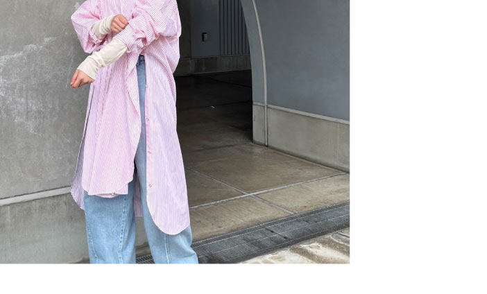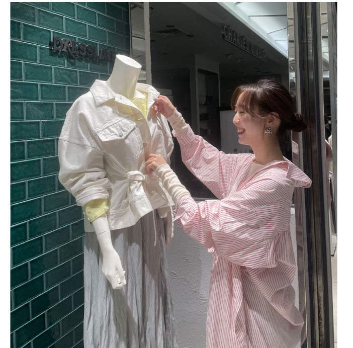今シーズンおすすめのストライブシャツドレスを主役に、明るいカラーのデニムとシアートップスを合わせた春らしいスタイル。