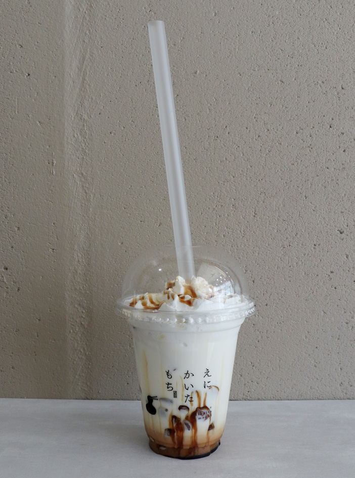 クリームたっぷりのタピオカドリンクに見えますが、こちらはわらびもちラテ。