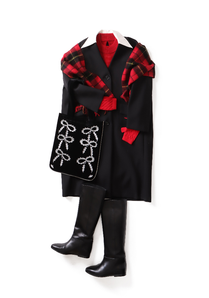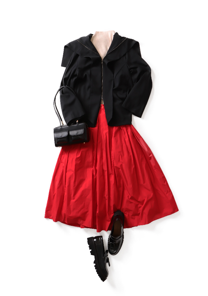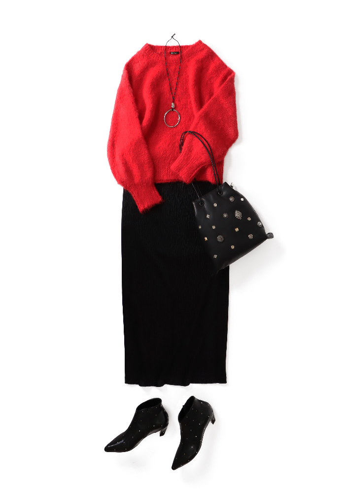 レッドを顔回りに持ってくると血色良く華やかな印象に。組み合わせるスカートは表面感のあるベロア素材を選択。シューズやバッグはスタッズ付きで存在感を発揮。