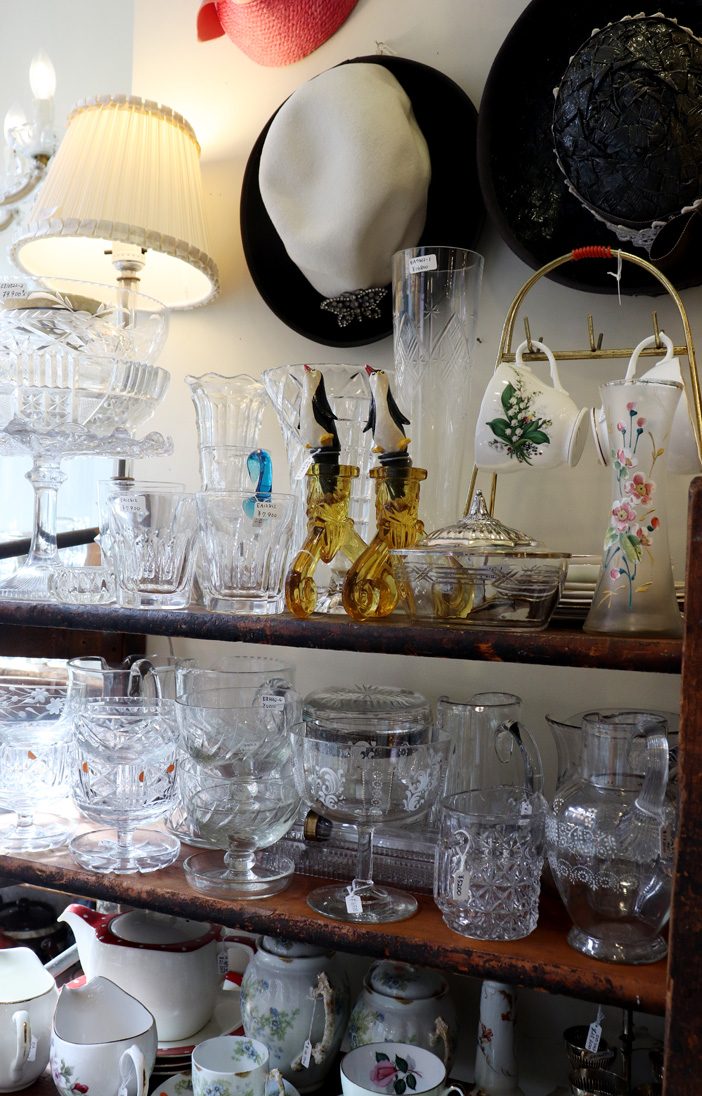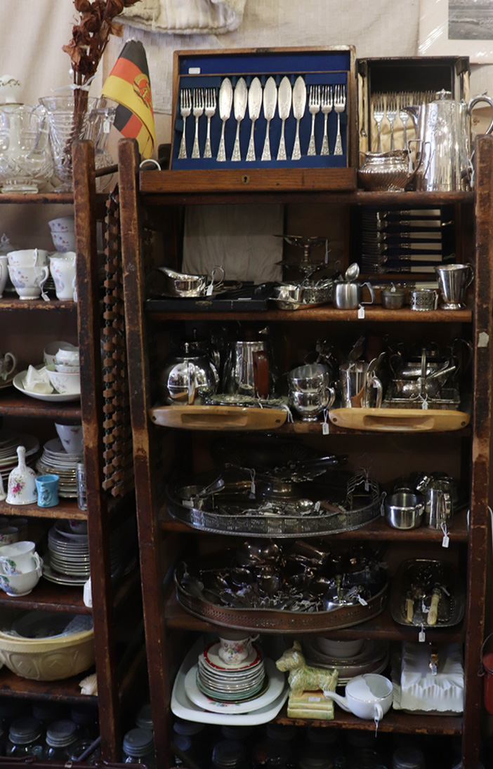 ガラス製品、子供服、家具、カトラリーと様々なジャンルのアンティーク雑貨が並びます。
