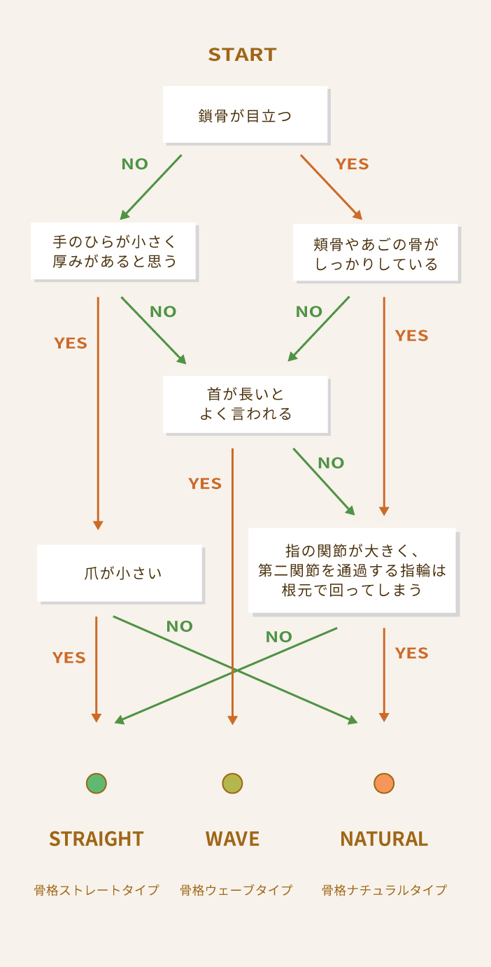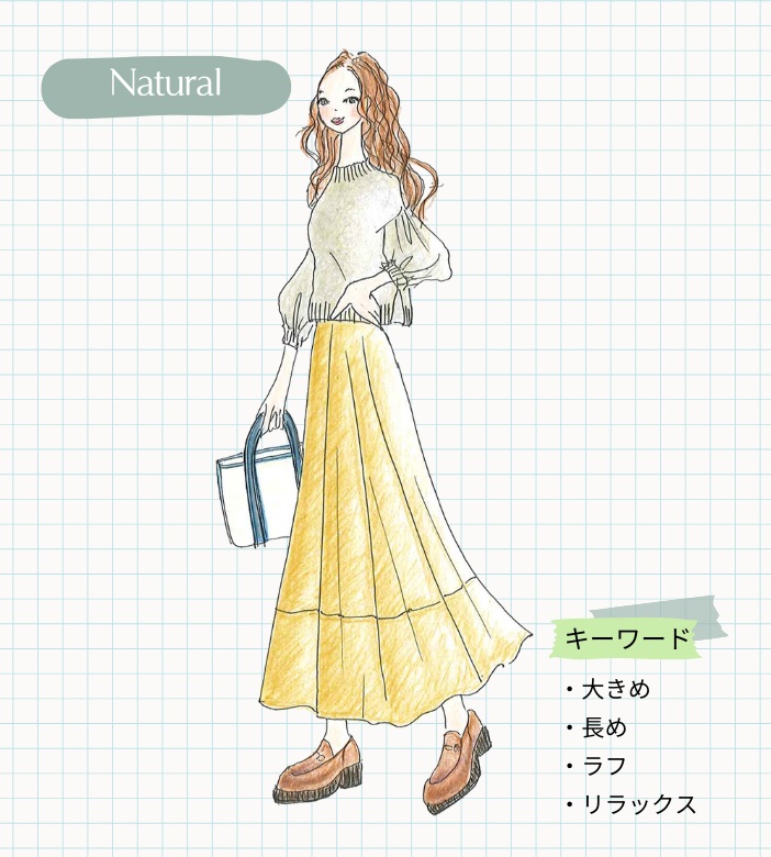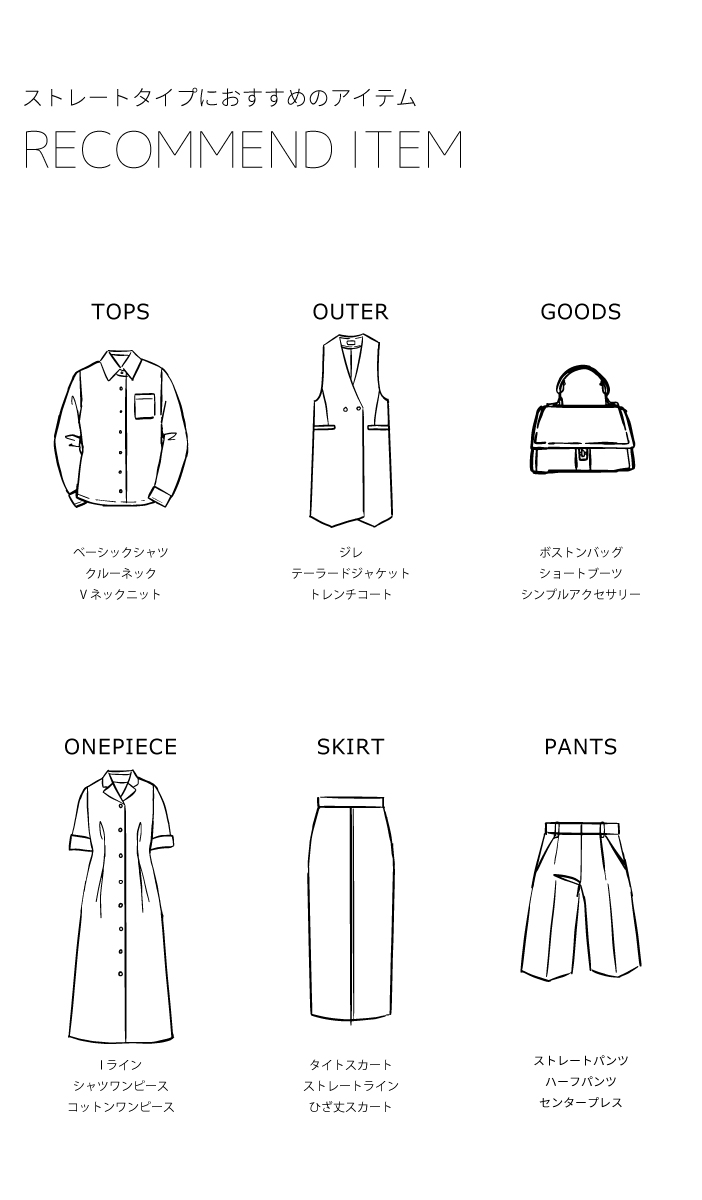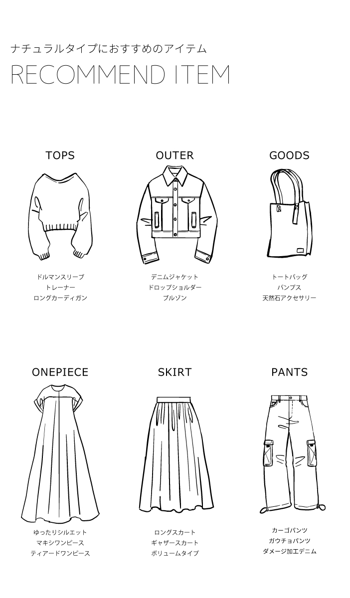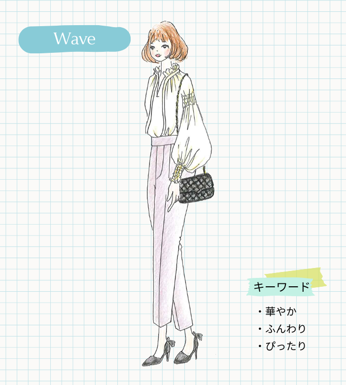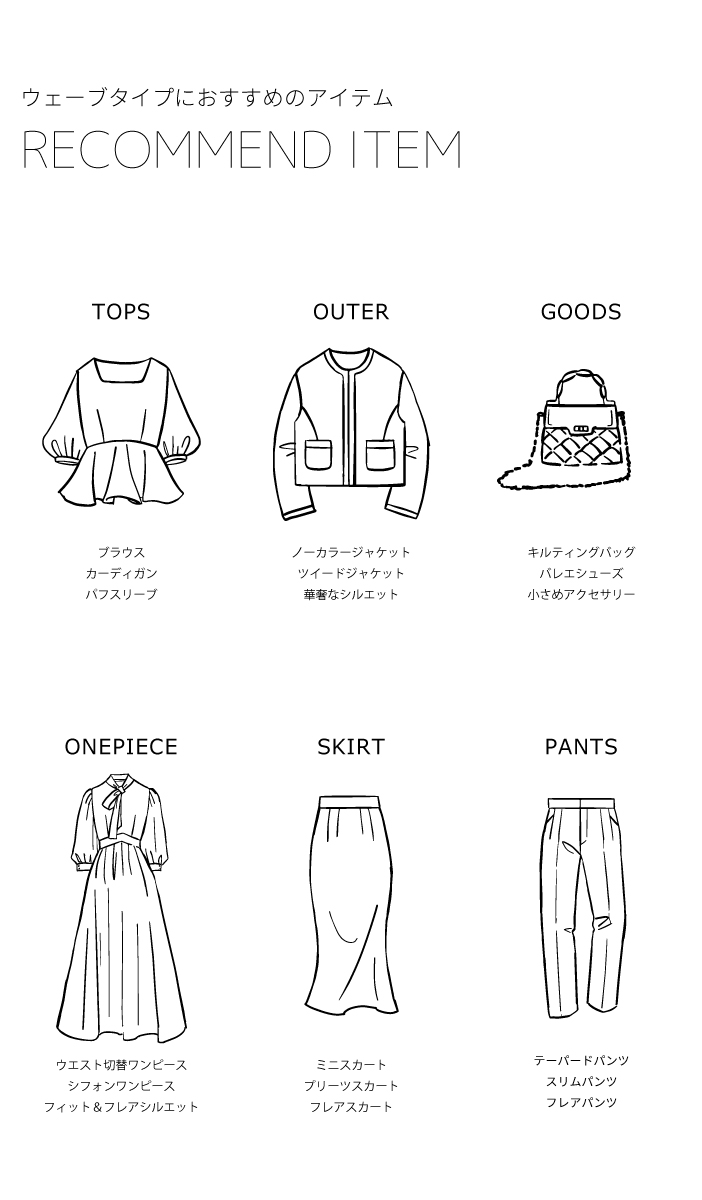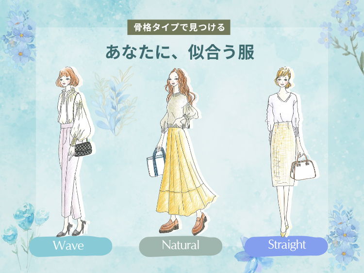 「ウェーブ」「ナチュラル」「ストレート」の骨格タイプごとにおすすめアイテムをご紹介します。