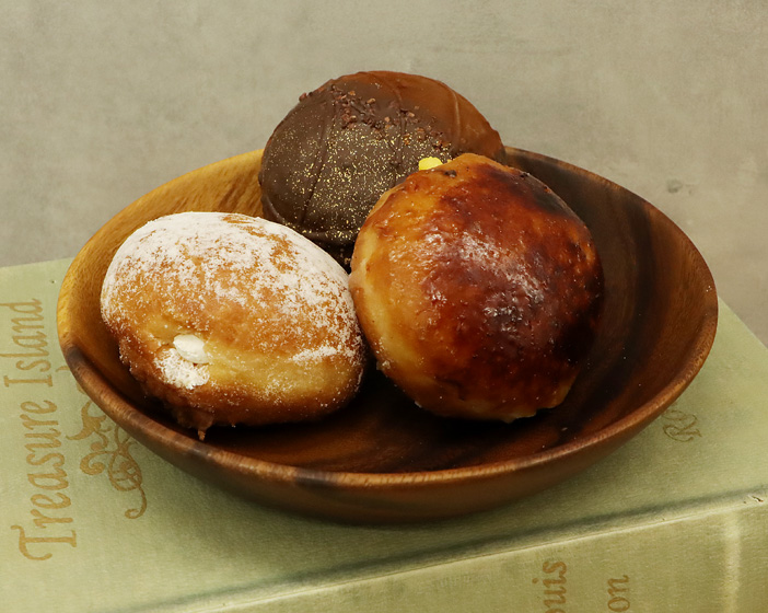 ハワイのマラサダとは雰囲気の違うオリジナリティのあるマラサダ。クリームブリュレなど珍しいフレーバーも。ドーナツというよりパンに近い食感で朝食にもおすすめです。左から【Wクリーム・チョコ・クリームブリュレ】
