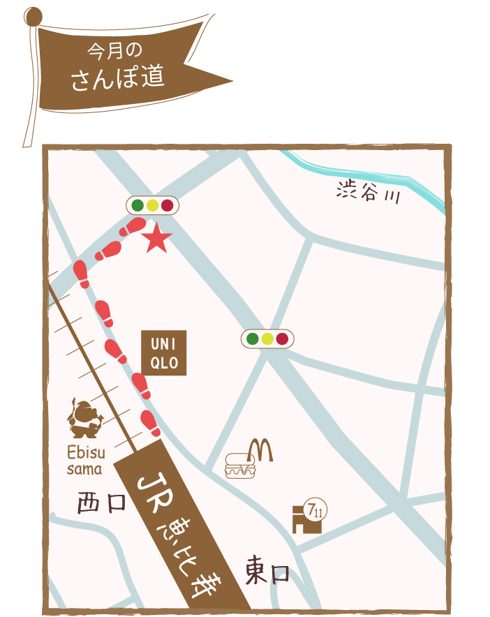 JR恵比寿駅の西口、ユニクロが見えたら左方面へ進みます。大通りに突き当たったら右へ折れて1つ目の交差点を右折するとすぐに見つかります。