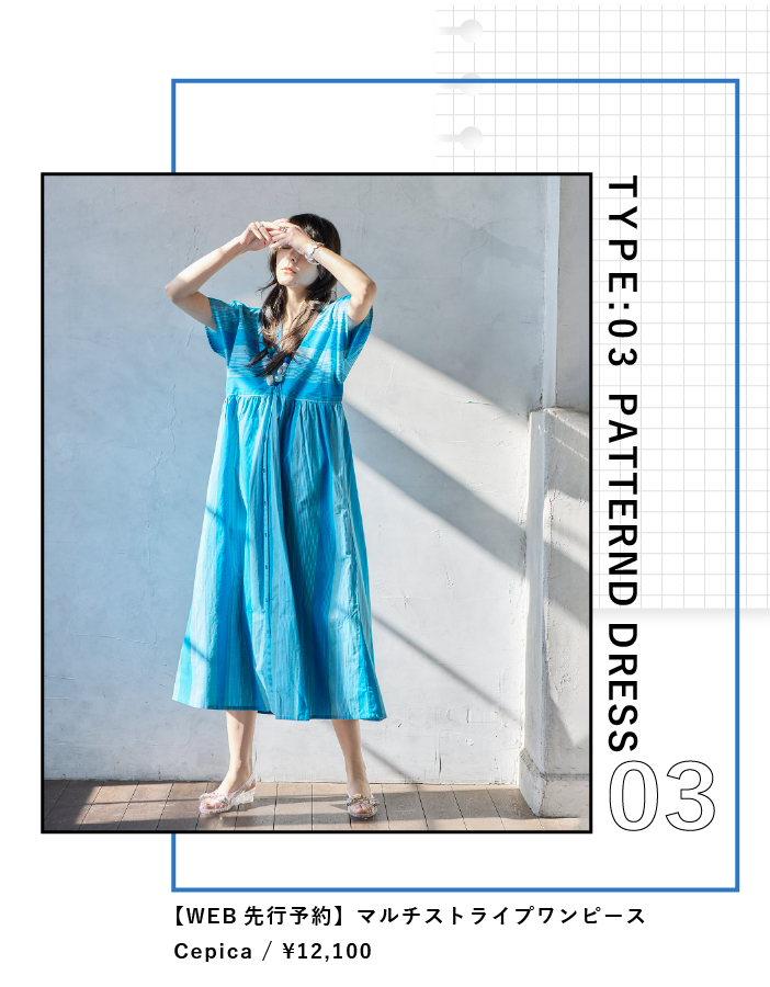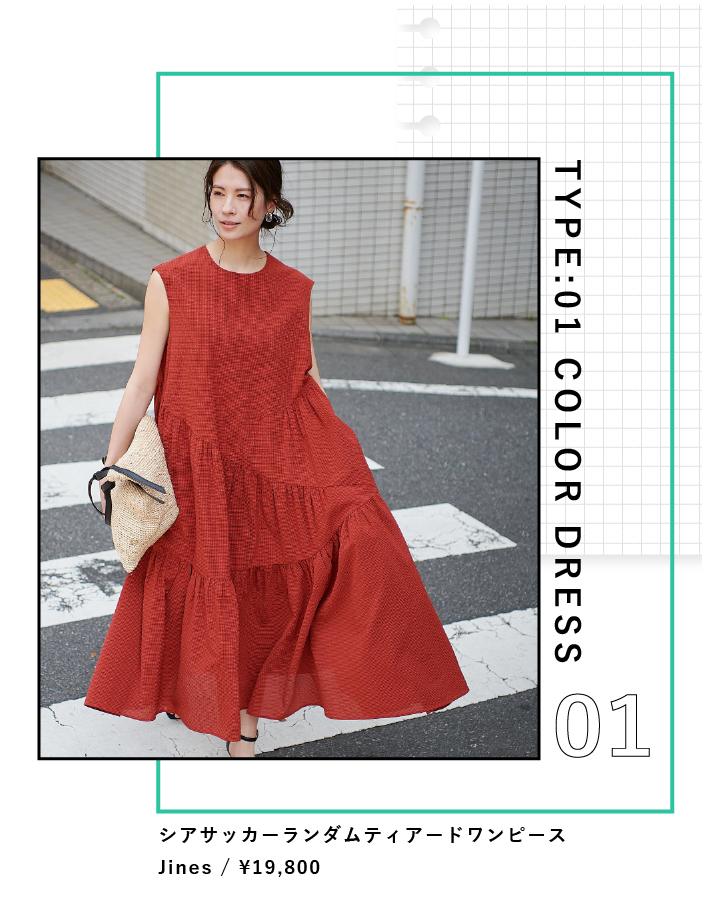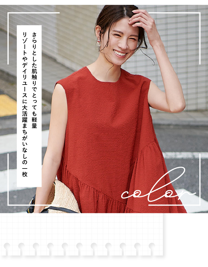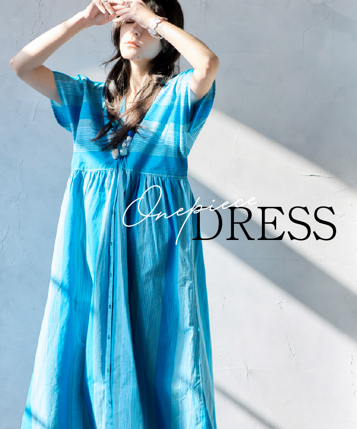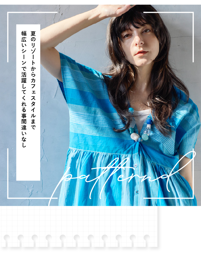 軽やかな素材と開放感のあるシルエットが魅力のワンピースは、街中でもリラックスムードを纏う。リゾート気分をさりげなく取り入れて暑い日も心地よく、気分まで軽やかに。