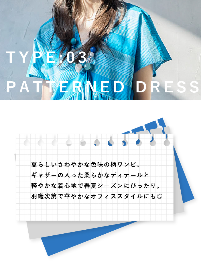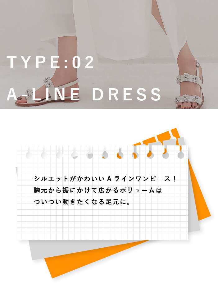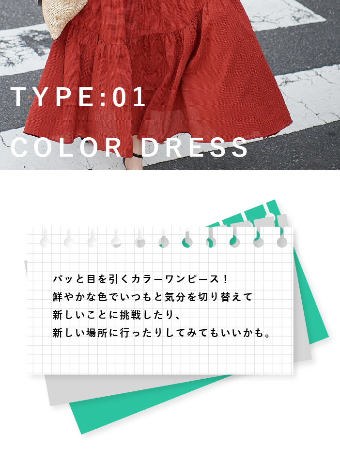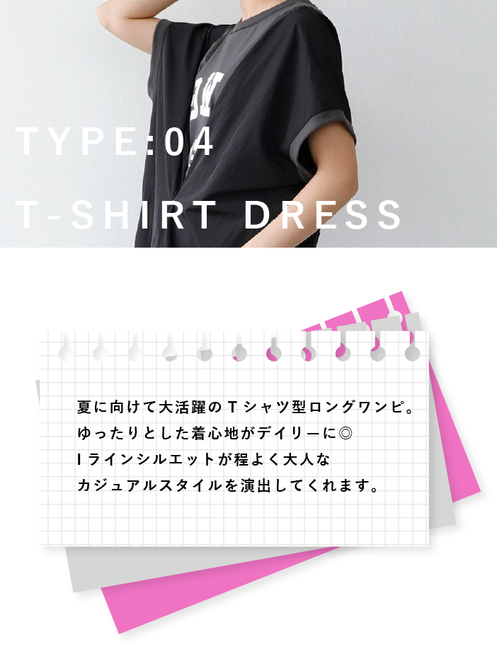 「カラー・Aライン・プリント・Tシャツ型」など、シルエットや素材ごとに4タイプに分けてご紹介します。