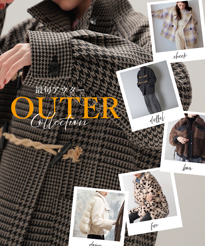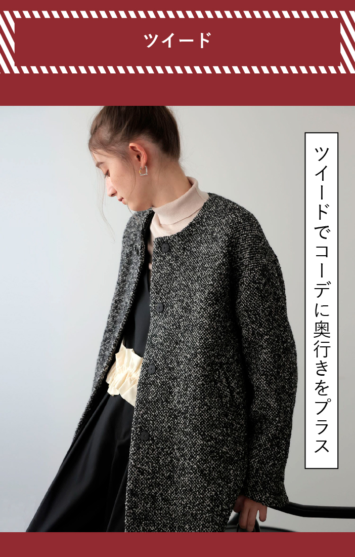PICK UP 王道チェックから今年の顔ファーコートまで、羽織るだけで主役になる今年のアウターを一気見せ!キーワードで見るトレンドも併せてぜひチェックしてみてください ▼気になるワードをクリック!▼ トラッドとモード感を兼ね備えた大人のビッグチェック。ラベンダーの差し色が遊び心とぬくもりを感じる配色。着映えはもちろんシーズンムードの高まるアイテムです。 ビッグチェックショートコートジネス¥25,300 gun club check duffle coatドレスレイブ¥57,200 ツイードは奥行きが出てコーデを上品にワンランクアップ◎シンプルなデザインが着回しやすく、かつ主役も張れるアイテム。流行りに左右されない一着におすすめです。 ループツイードノーカラージャケットジネス¥42,900 <B7>tweed cocoon coatドレスレイブ¥59,400 学生っぽくなりがちなダッフルコートは丸みのあるシルエットと配色釦でニュアンスのあるデザインがおすすめ。インナーを選ばない丈感が今年らしい着こなしに。 popcorn duffle coatドレスレイブ¥59,400 <STUMBLY × DRESSLAVE>Short Duffle Jacketドレスレイブ¥64,900 ツイードは奥行きが出てコーデを上品にワンランクアップ◎シンプルなデザインが着回しやすく、かつ主役も張れるアイテム。流行りに左右されない一着におすすめです。 sculptural long coatドレスレイブ¥59,400 パターンMIXキルティングロングコートスリーフォータイム¥8,690 <B7>bonding cocoon coatドレスレイブ¥47,300 シャルムビーバーロングコートジネス¥57,200 ミドル×ダークなトーンを楽しむ大人のバイカラーコート。【STUMBLY (スタンブリー)× DRESSLAVE】のハイブリッドデザインのコートはスタイリングにメリハリをプラス。 <STUMBLY × DRESSLAVE>CPO/mods combination CTドレスレイブ¥69,300 バイカラーロングコートセピカ¥19,800 <STUMBLY × DRESSLAVE>Color Blocking Officer Trench Coatドレスレイブ¥86,900 今年の一大トレンドのファーコート。スタイリングに加えるだけでシーズンムードが高まり暖かさも兼ね備えた優秀アイテム。丸みのあるシルエットがコーデに艶感を加えてくれます。 【タトラス/TATRAS】 BARBRA スタンドカラーファーブルゾンジネス¥71,500 ミンクエコファーブルゾンスリーフォータイム¥18,700 アニマルエコファーミドル丈ジャケットスリーフォータイム¥19,800 middle fur coatドレスレイブ¥34,100 ファーに続きボア素材もトレンドに。コロンとしたショート丈がおすすめ。【TATRAS(タトラス)】のシープ調ボアブルゾンはランダムな表情がコーディネートに温かみをプラス◎ 【マルシャルテル/MARECHAL TERRE】 ボアブルゾンセピカ¥36,300 【タトラス/TATRAS】 LUELA ボアスタンドカラーブルゾンジネス¥66,000 hyper texture bomber jacketドレスレイブ¥39,600 <VENIT>REVERSIBLE BOA JKドレスレイブ¥70,400 人気ブランド【MARECHAL TERRE(マルシャルテル)】をはじめショート丈ダウンを展開。襟元のボリューム感がバランスの鍵◎暖かさと動きやすさが今の気分にマッチしたスタイルです。 【ケープホーン/CAPE HORN】 ALVAREZ ダウンジャケットジネス¥82,500 【マルシャルテル/MARECHAL TERRE】 スタンディングカラーダウンジャケットセピカ¥38,500 フェイクムートン切替ダウンジャケットジネス¥41,800 【ケープホーン/CAPE HORN】 MATT STELLA ダウンジャケットジネス¥66,000 アウター一覧を見る 他のPICK UPを見る サイトTOP