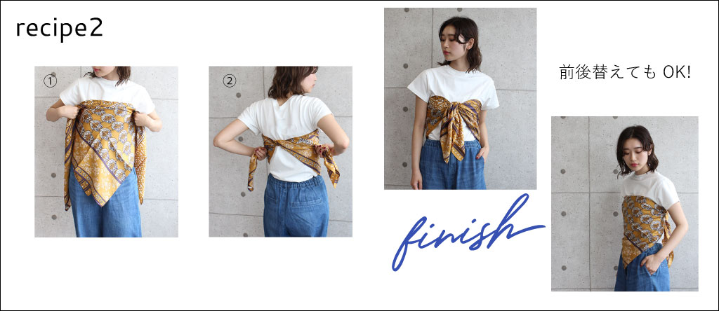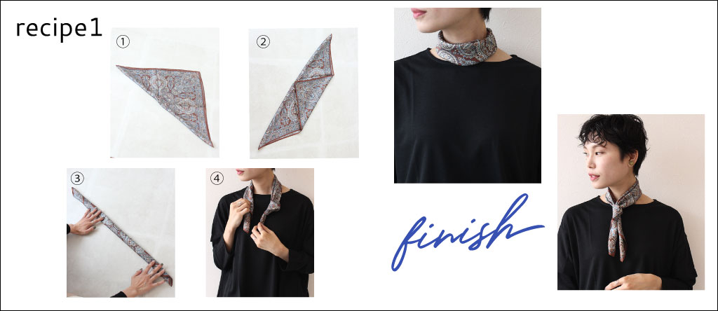 ④1/4の辺りで一つ結びをしたらネックにかけて、結び目に反対側のスカーフを入れ込みます。