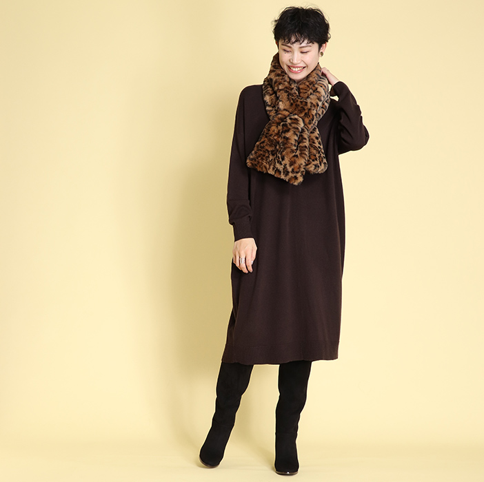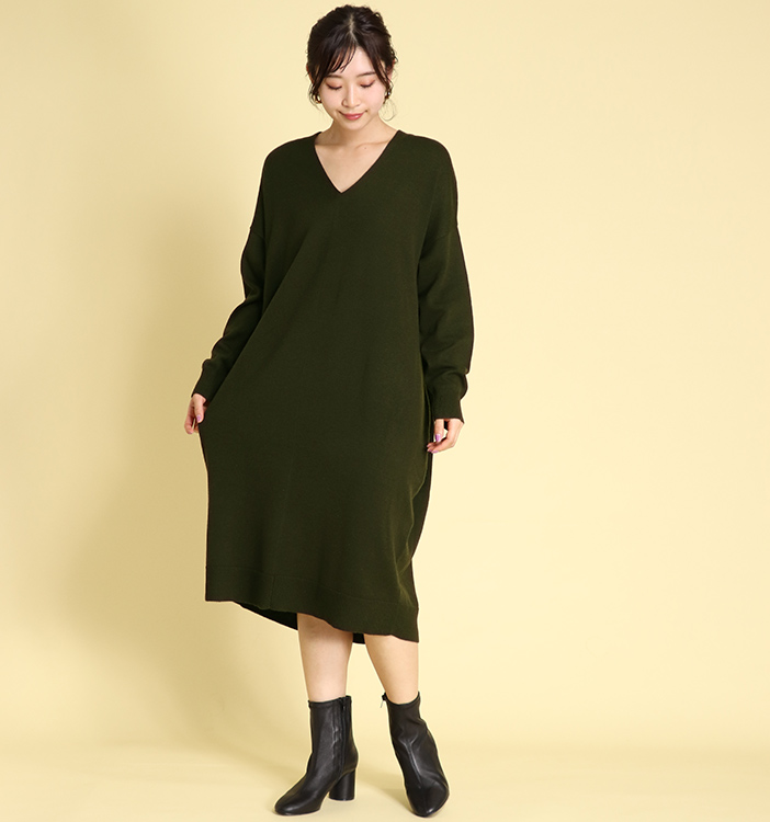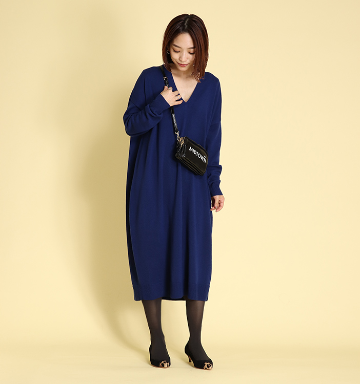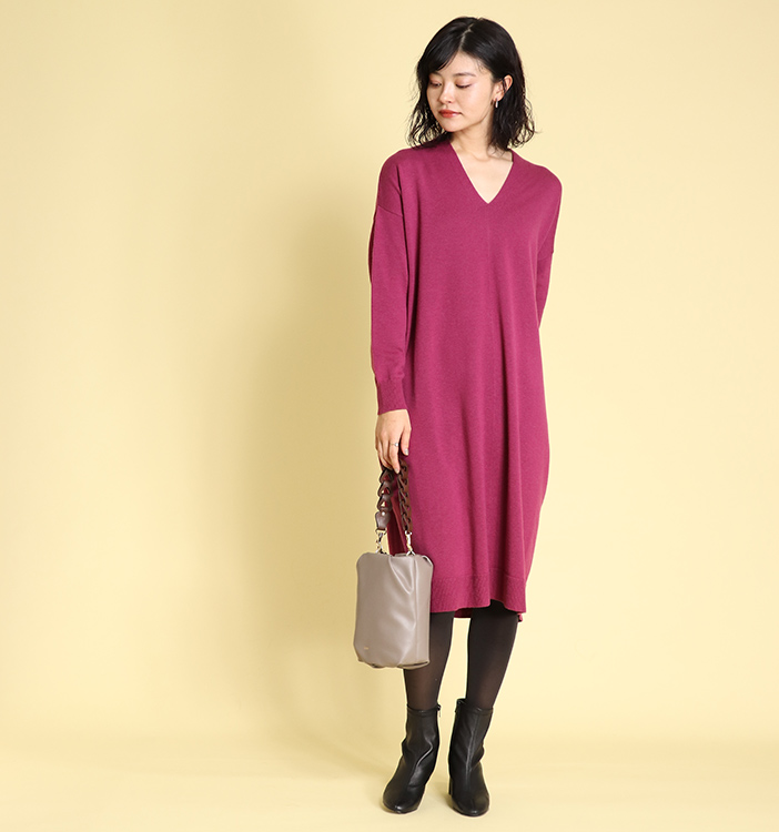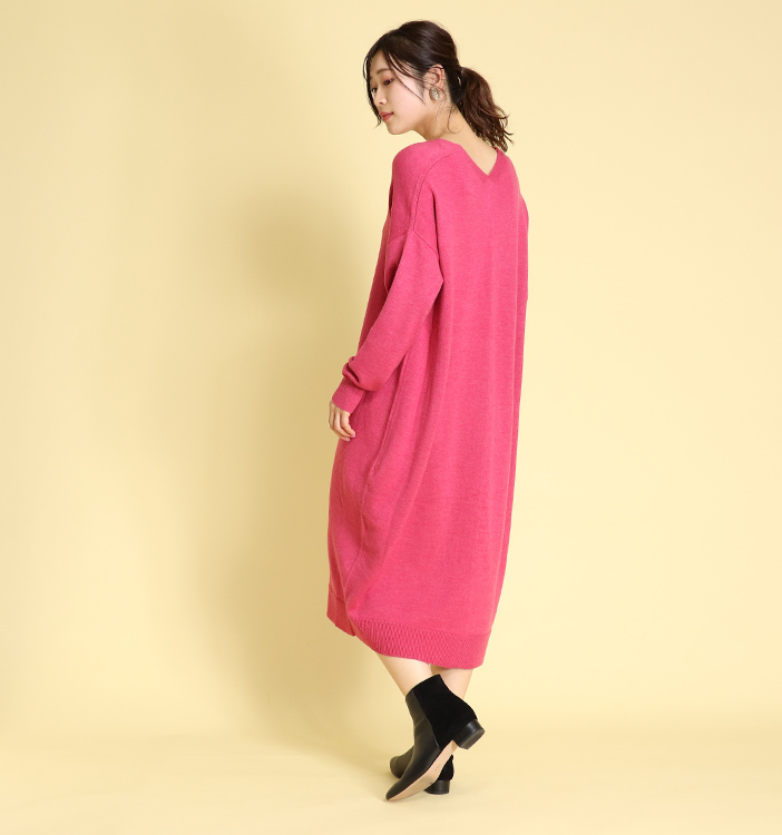 女性らしいネックラインにゆるりとしたラインのニットワンピース。