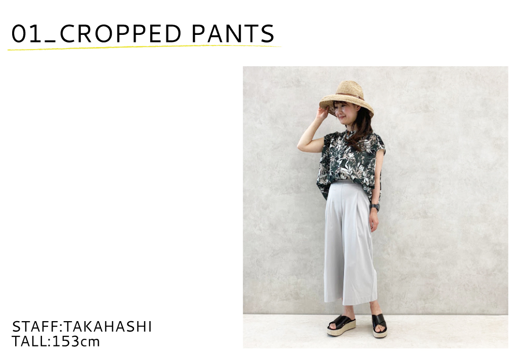 1でご紹介したNO.95000510 トリコット編みクロップドワイドパンツとベルト付きノースリーブカットソーは同素材なのでセットアップで着用できます。きちんと感があるのでオフィスでも活躍します。