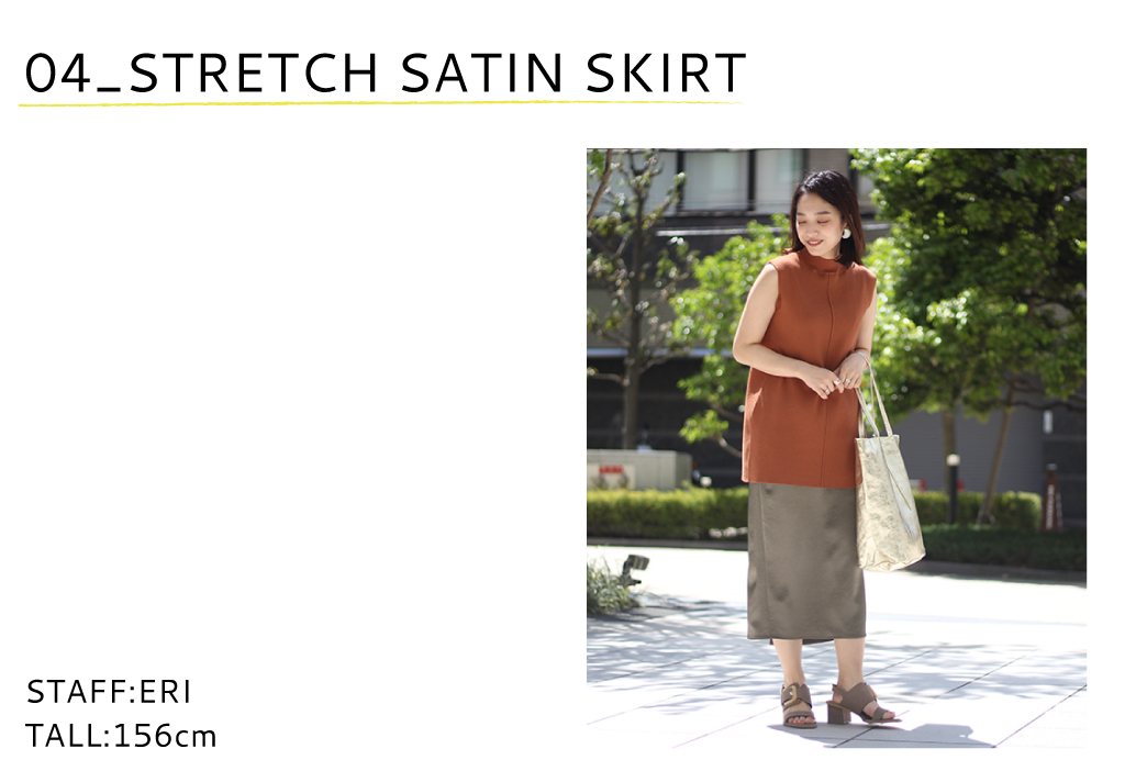サテンですがシワ感がある素材で女っぽさもありながら、カジュアルにも合うタイトスカートです。足さばきも良くウエストゴムで着心地がとても良いです。今回のスタイリングのようにニットできれいめに合わせたり、オフはTシャツで合わせてデイリーに楽しめそうです。