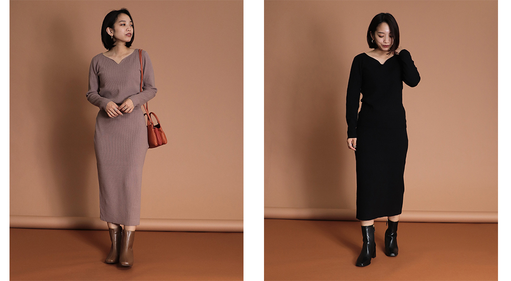 TITE in the storeで毎シーズン人気のハートネックリブニットのセットアップ。